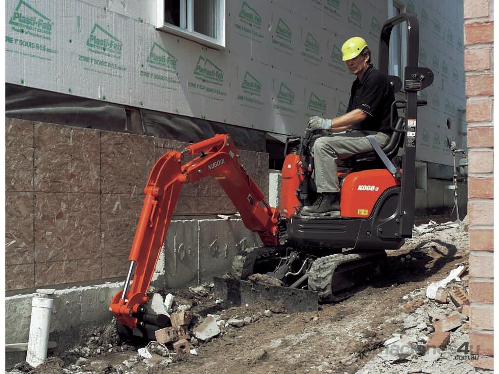 For sheer productivity, no other ultra-compact excavator measures up to the Kubota K008-3.Powered by a Kubota 10.3HP engine, renowned worldwide for their exceptional reliabilty, the Kubota K008-3 sets the standard for all other excavators in its class. Featuring a spacious and comfortable operator area, the Kubota K008-3 is the ideal choice for tough jobs where space is limited.