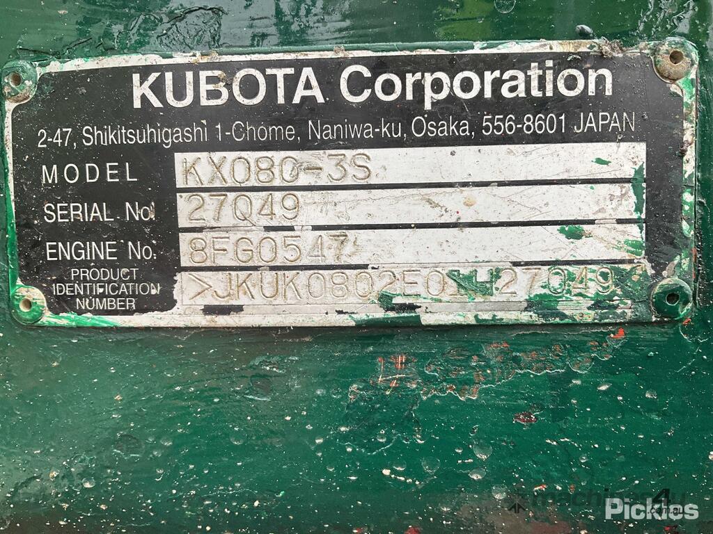 No C/P,Kubota,KX080-3S,Excavator (Steel Tracked),Engine #: 8FG0547,4 Cyl,Diesel Turbo,Odometer not visible,950 (Hrs. Showing on Hour meter),Colour: Green,Unregistered,VIN: JKUK0802E01H27049,Serial No: 27049,ROPS No: 154L063,Sold with No Plates,Key No: 350