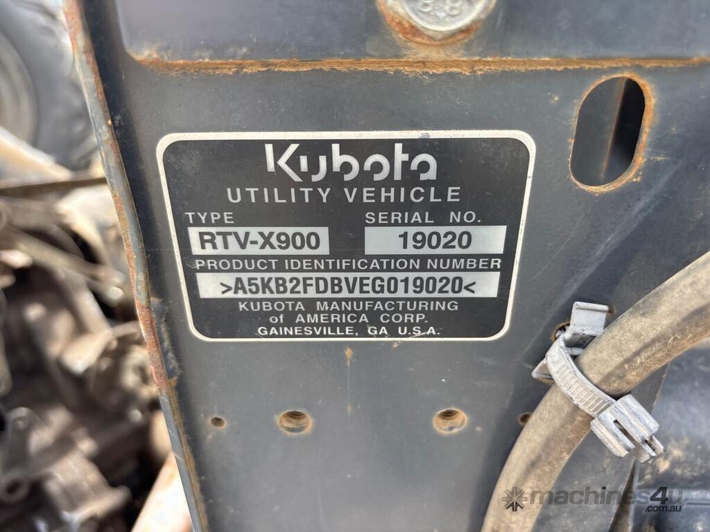 CP: CIRCA null,Kubota,RTV X900,Utility,Odometer not visible,Hourmeter not visible,Unregistered,Serial No: A5KB2FDBVEG019020,Sold with No Plates,WOVR Status: WOVR N/A,Incident Type: Impact