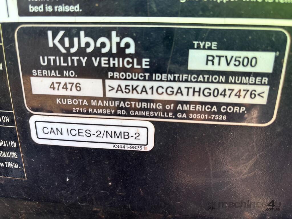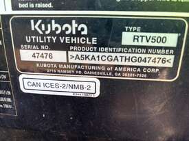 No C/P,Kubota,RTV500,ATV/VTT,1 Cyl,Petrol,2210 (Hrs. Showing),Colour: Orange,Unregistered TAS,VIN: A5KA1CGATHG047476,Serial No: 47476,Sold with No Plates,Key No: 1
