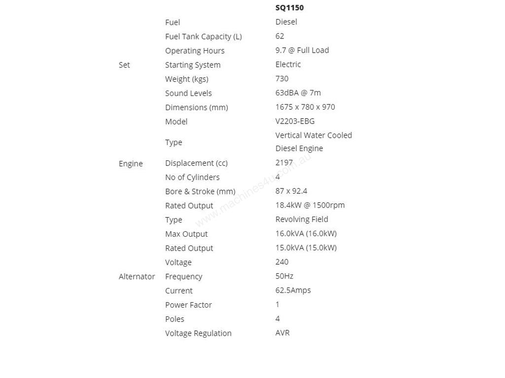The Kubota SQ1150 is a premium compact single phase four pole diesel generator with a capacity of 15kVA at 1500RPM. Fully sound attenuated for a super quiet operation.