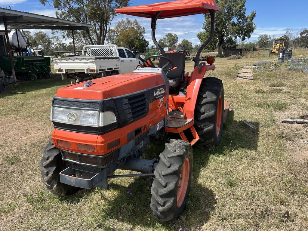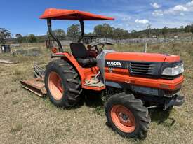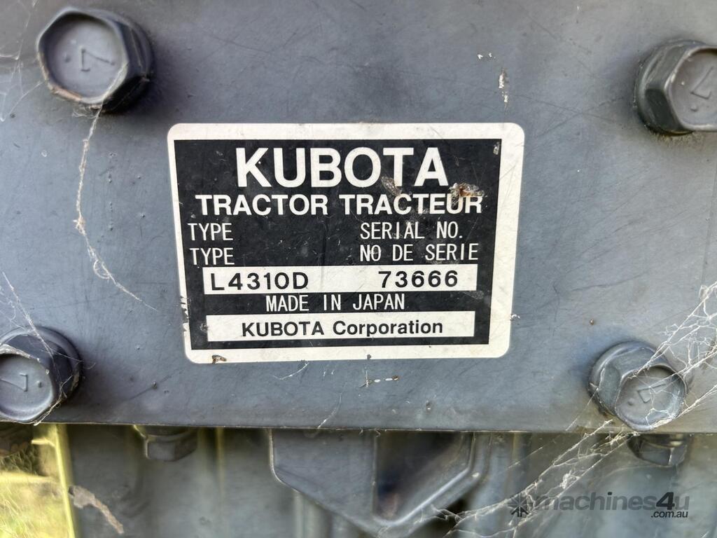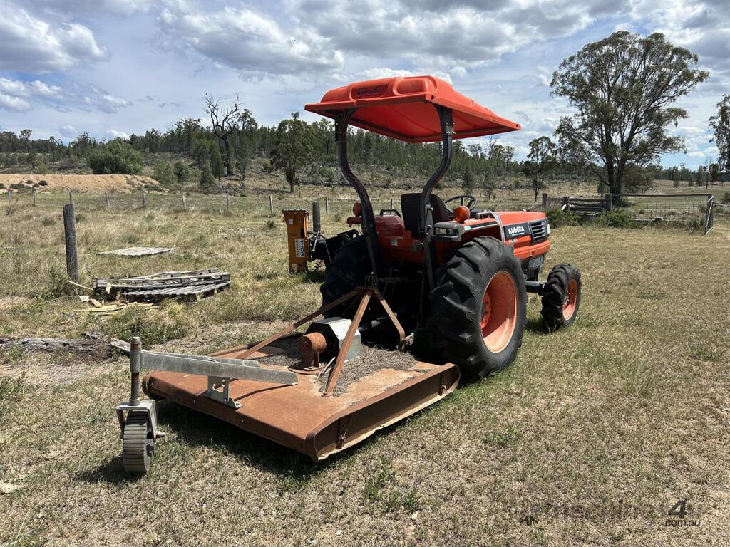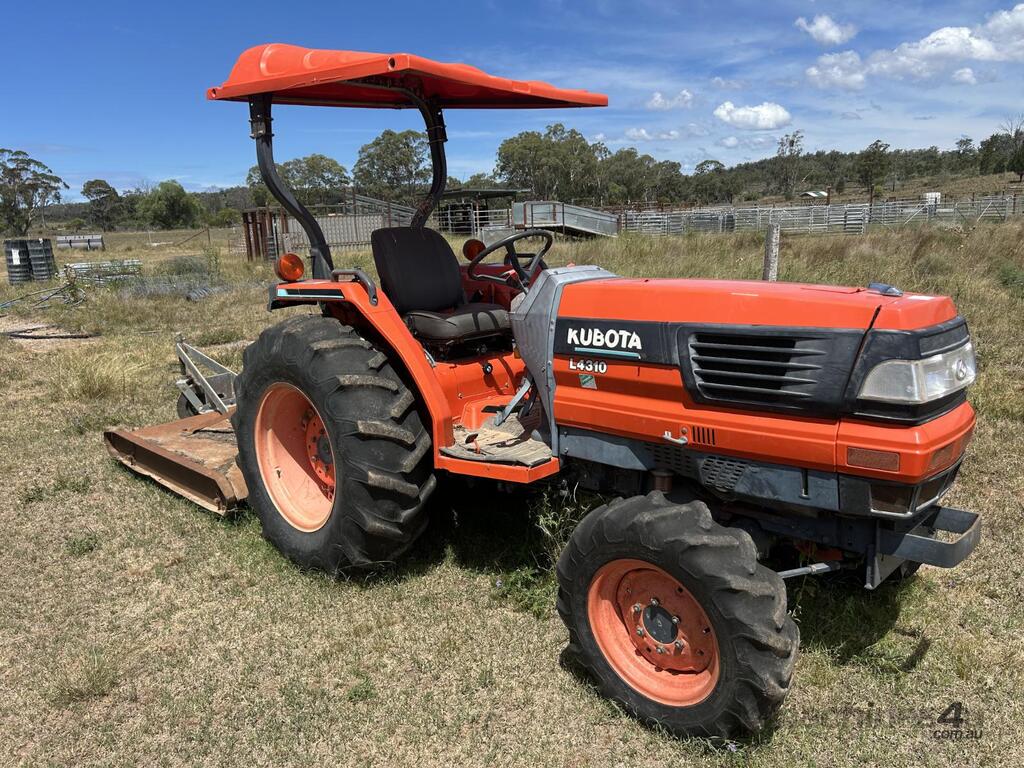 Kubota L4310 43 HP tractor with 5' slasher attached on 3 point linkage and shade cover. Only 759 hours on the clock and still starts, idles and runs well. PTO smooth to engage and slasher drives without any trouble and blades have plenty of life left in them. All-in-all a pretty handy unit that will be great on a smaller block clearing paddocks, tracks or fence lines. For more information on the L4310 model specifications please follow this link: .tractordata/farm-tractors/001/2/5/1251-kubota-l4310.html