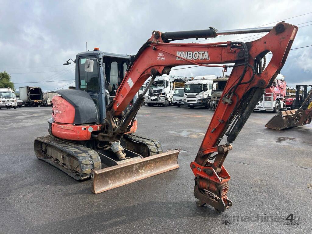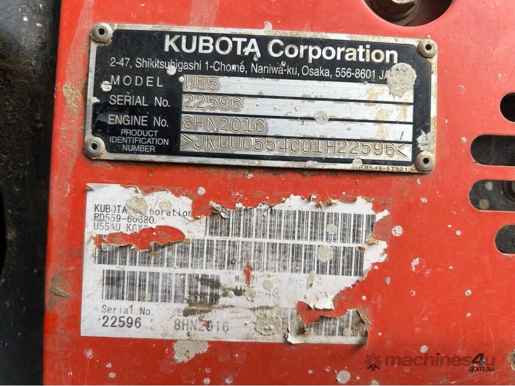 No C/P,Kubota,U55-4,Excavator (Rubber Tracked),Engine #: 8HN2016,4 Cyl,Diesel,Odometer not visible,6382 (Hrs. Showing on Hour meter),Colour: Orange,Rego. No: 64649C QLD,VIN: JKUU0554C01H22596,Serial No: 22596,Sold with No Plates,WOVR Status: WOVR N/A,Incident Type: Impact,Key No: 75