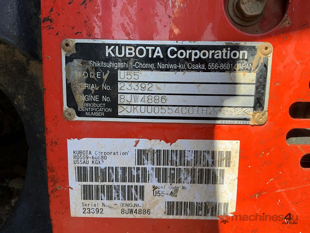 No C/P,Kubota,U55-4,Excavator (Rubber Tracked),Engine #: 8JW4886,4 Cyl,Diesel,Odometer not visible,5832 (Hrs. Showing on Hour meter),Colour: Orange,Unregistered NSW,VIN: JKUU0554C01H23392,Serial No: 23392,ROPS No: 18Y1791,Sold with No Plates,Key No: MO KEY