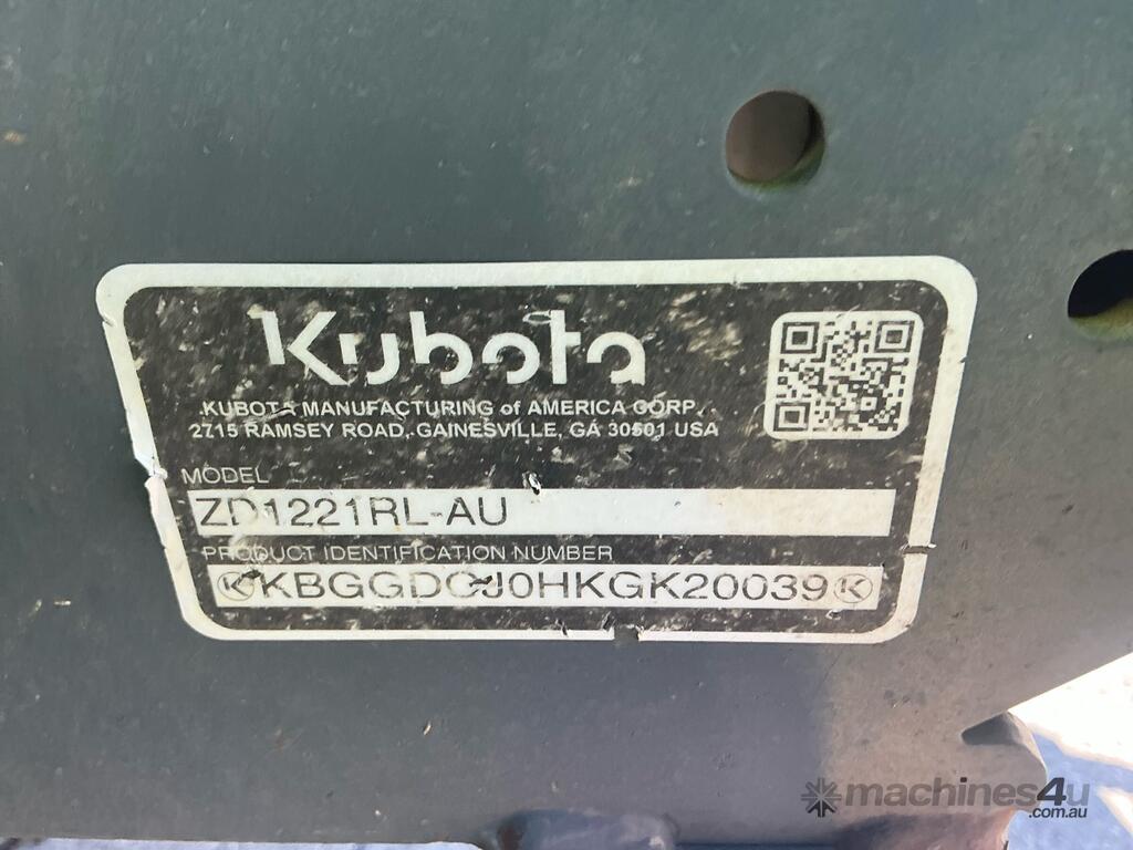 No C/P,Kubota,ZD1221RL-AU,Ride On Mower,Diesel,Odometer not visible,1728 (Hrs. Showing on Hour meter),Colour: Orange,Unregistered,Serial No: KBGGDCJ0HKGK20039,Sold with No Plates