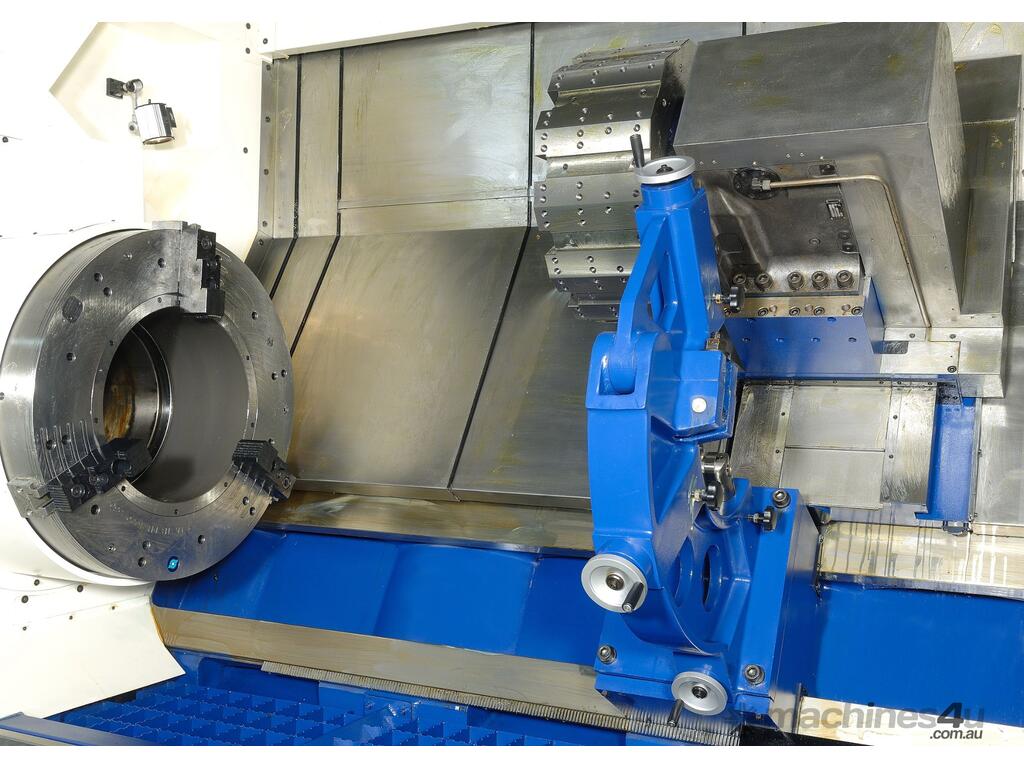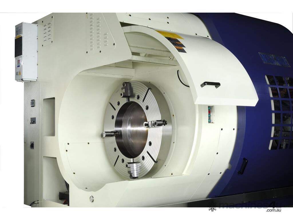 The SB series is a heavy duty slant bed lathe. Hollow spindles available from 9 to 30 inch. Between centers from 40 - 204 inches. Outstanding Features. * One piece bed, 60° slant bed construction ensures maximum stability and convenient chip disposal. * Alloy steel spindle with opposed taper roller bearings. * All gears in the headstock are hardened and precisely ground. * Automatic ranges of spindle speed through pneumatic gear shift. * Spindle speed ranges are automatically changed by M code. * Infinitely variable speed are commanded by S code. * Tool change are commanded by T code. * Auto lubrication system is equipped for headstock, carriage, and cross-slide. * Precision tapered roller bearings are equipped on the spindle and the quill. * The quill is heat treated and precisely ground. * Internal taper of quill to suit MT#6 dead center or live centre. * Turcite B anti friction material is applied on cross slide and carriage for reduce friction. * X and Z axis ballscrews are protected by covers to prevent ingress of swarf / chips and coolant.