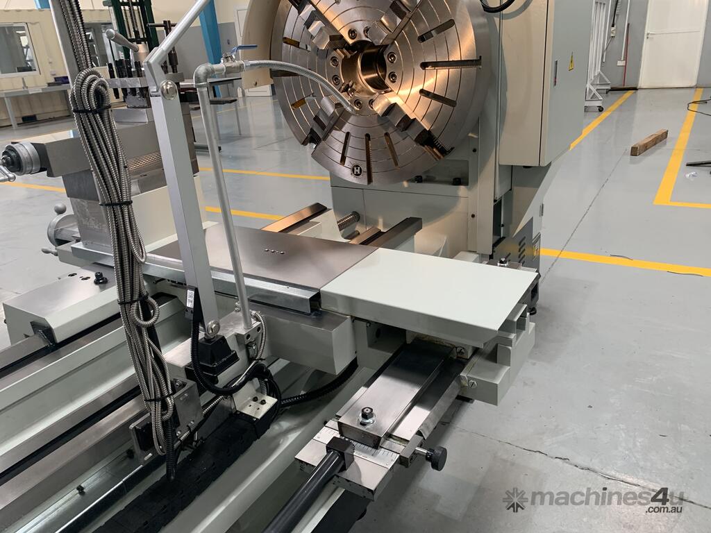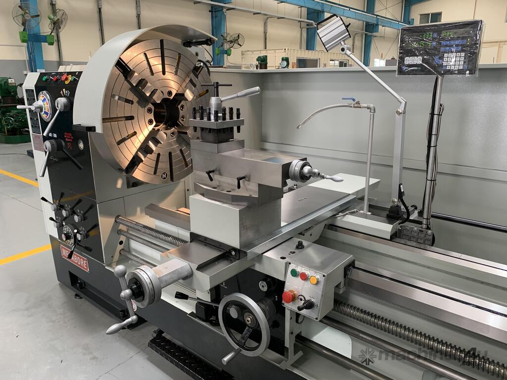 Precision Taiwan built machine Swing 980 mm 4000 mm centers 150 mm bore •The spindle is supported by precision tapper roller bearings. •Cross slide heat treated and is finished with precision grinding. •INTERNAL STRUCTURE OF HEADSTOCK Headstock is uniquely designed to use high class iron and all running parts are lubricated by pressure pump.Forced lubrication system is employed for headstock to ensure its lubrication and cooling when high speed is used and keep accuracy. Gears in the headstock are made of chromium molybdenum steel (SCM-21), treated with cementation and precise grinding to provide smooth and quiet running. •THE STRUCTURE OF BASE One piece of base is made of meehanite casting, which is hardened and precision ground. Machines available with Hollow Spindles to 230 mm (9 in) Please check for current stock situation.