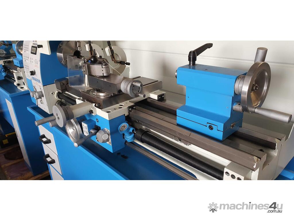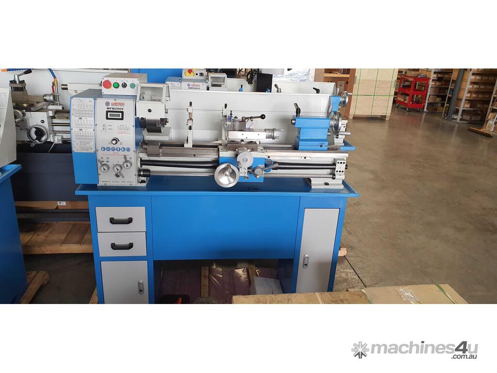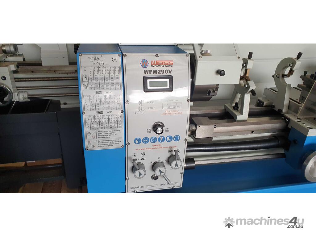 FEATURES:* This WF290VF lathe has induction hardened & ground V-Way bed for durability and long service life * Spindle is suported by precision taper roller bearings * Powered logitudinal feed allows for threading * Spindle bore of 38mm makes this lathe very versitile * Comes complete on stand * Fitted with Delta inverter and 1.5kw motor variable speed 3 phase * Spindle D1-4 camlock mount.