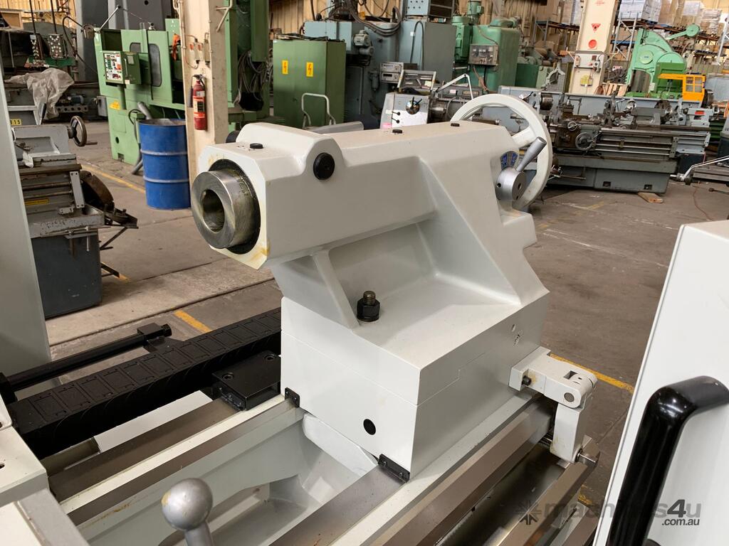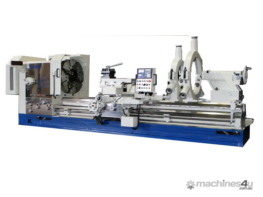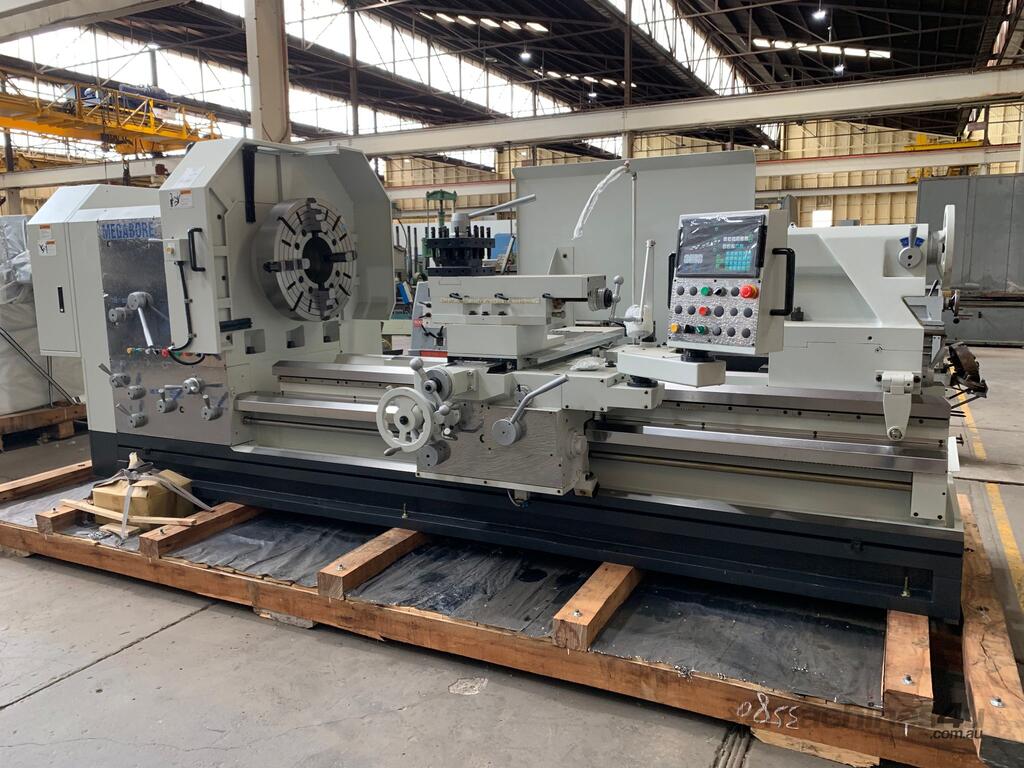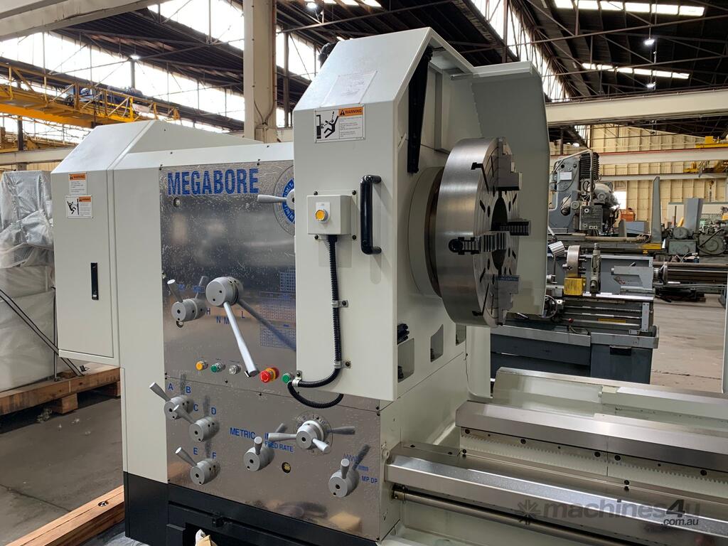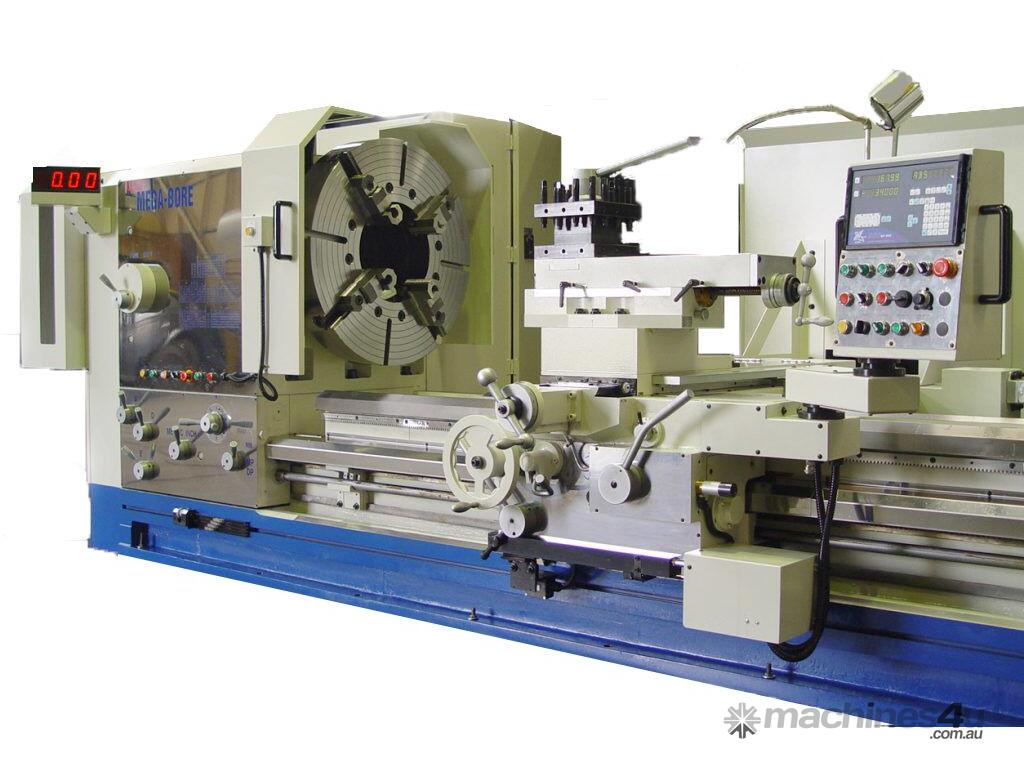 The Megabore PA series is a versatile lathe for those who require an easy to operate heavy machine offering versatility and rigidity. The machine is available in a variety of swing diameters, center distances and hollow spindles. Please send your enquiry for an immediate quote. Model Designation PA-35 to PA-50 FEATURES * One piece bed, floor type casting. * 2 shear bed way with extra way supporting the apron. * All ways are hardened and ground. * Alloy steel spindle with opposed taper roller bearings. * Hardened and ground gears, shafts. * Electromagnetic spindle brake. * 18-speed geared headstock. * 6-way rapid traverse and power feed to top slide. * Totally enclosed universal inch / metric gear box. * Carriage position device. * Dual voltage spindle motor, 20 to 50 HP. * Pressurized one shot lube system for cross slide and carriage.