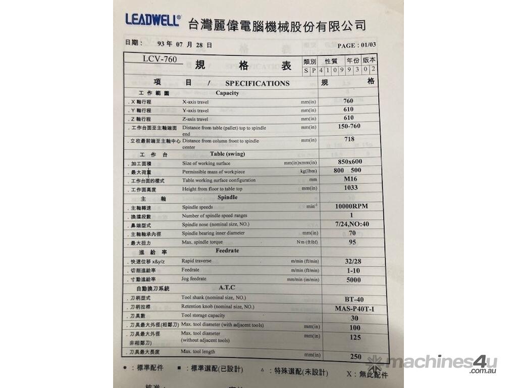 LEADWELL CNC MILL LCV-760 :      $22,000 AUD($24,200 Inc. GST)