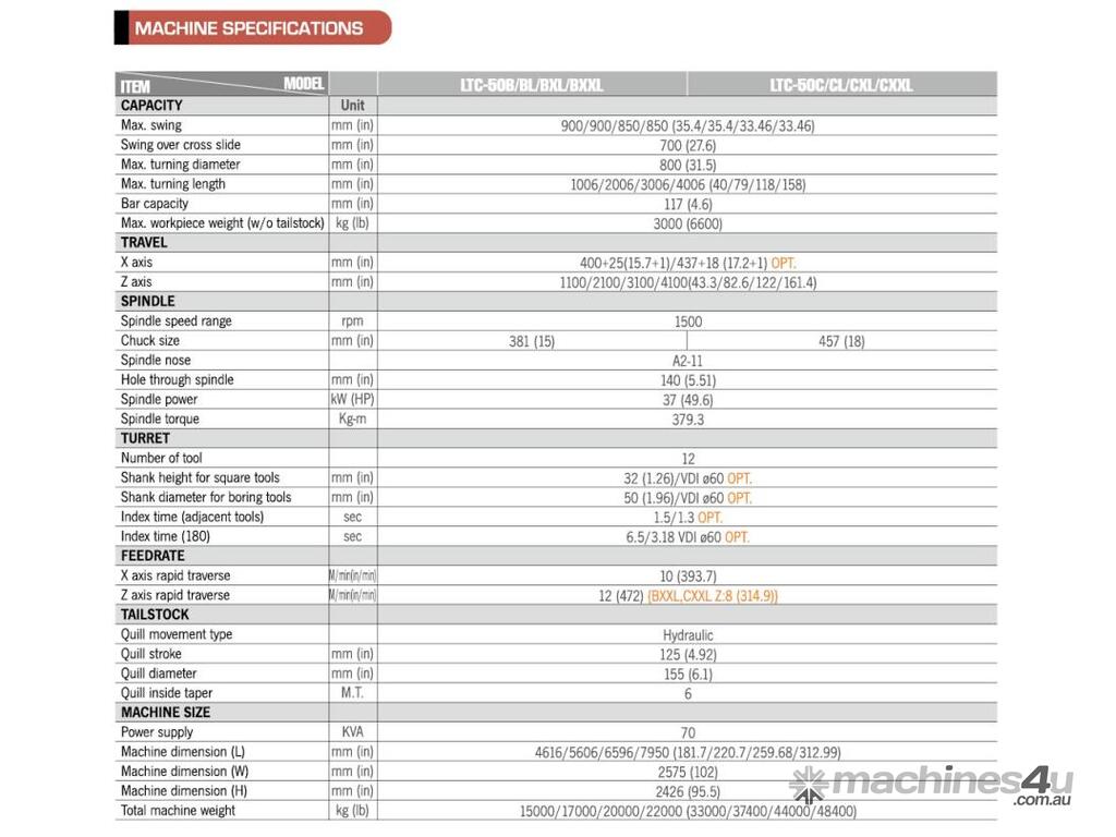 The tailstock is hydraulic and programmable on all LTC-50 models adding to the rigidity of the machine.