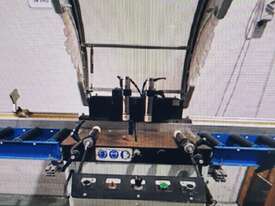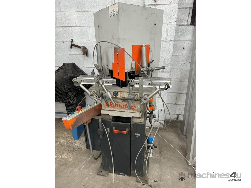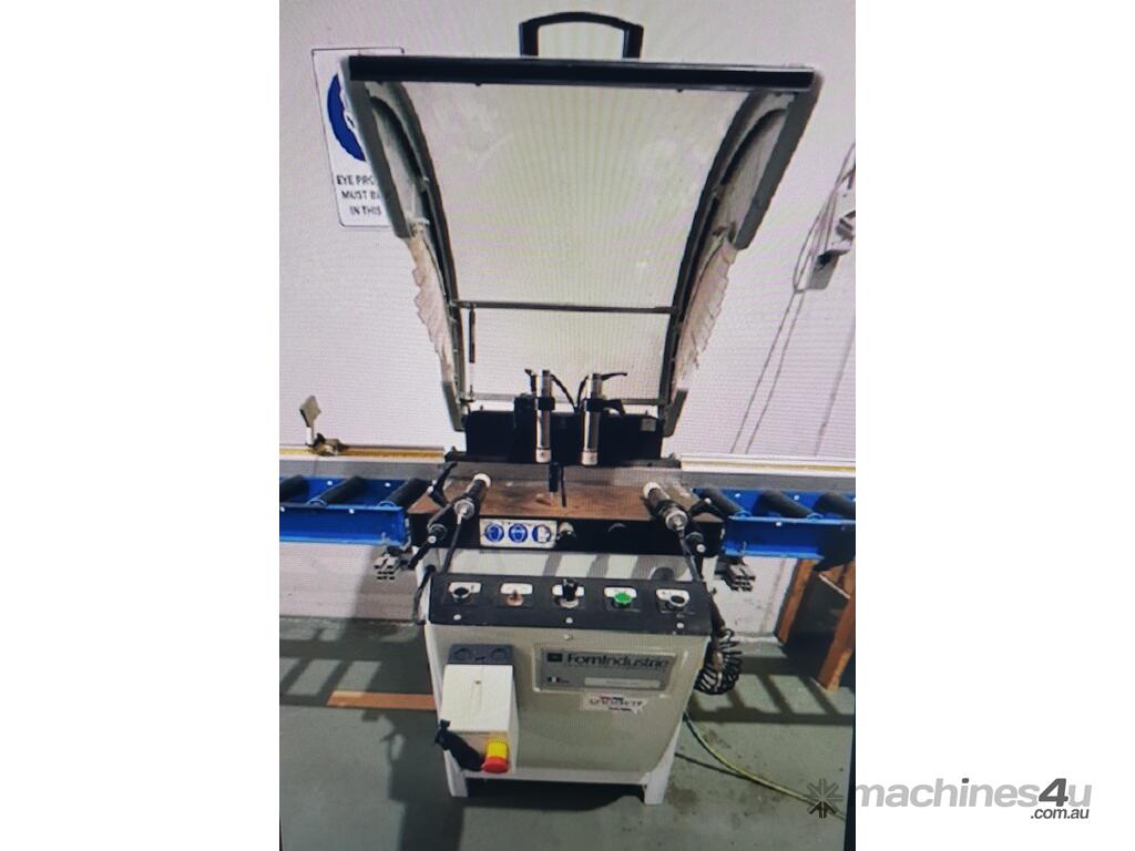 ALFAMACCHINE by Forli T400 TWIN V 45deg MITRE SAW MADE IN ITALY, 2 x 400mm BLADES, PNEUMATIC SEMI-AUTO OPERATION - VERTICAL CLAMPING, INFEED/OUTFEED OUTRIGGER TABLES/FENCE/STOPS Suit SECURITY SCREEN DOORS, PICTURE FRAMES etc - ALUMINIUM/TIMBER/PLASTICS etc, HEAVY DUTY, CURRENT MODEL, VERY GOOD CONDITION