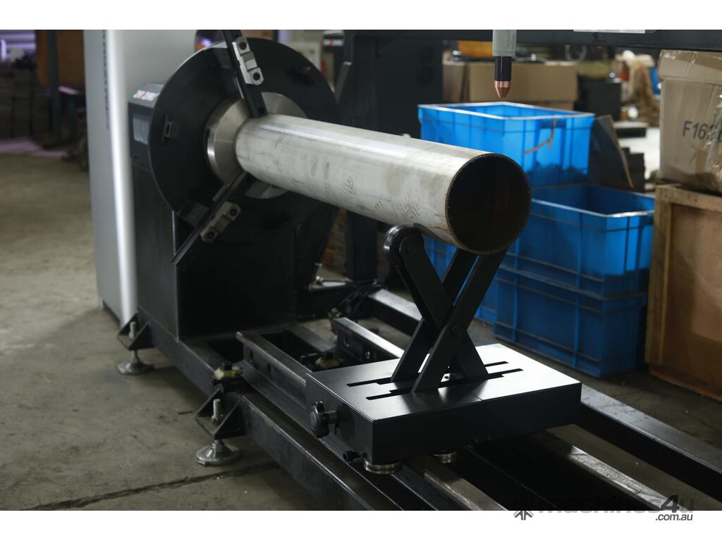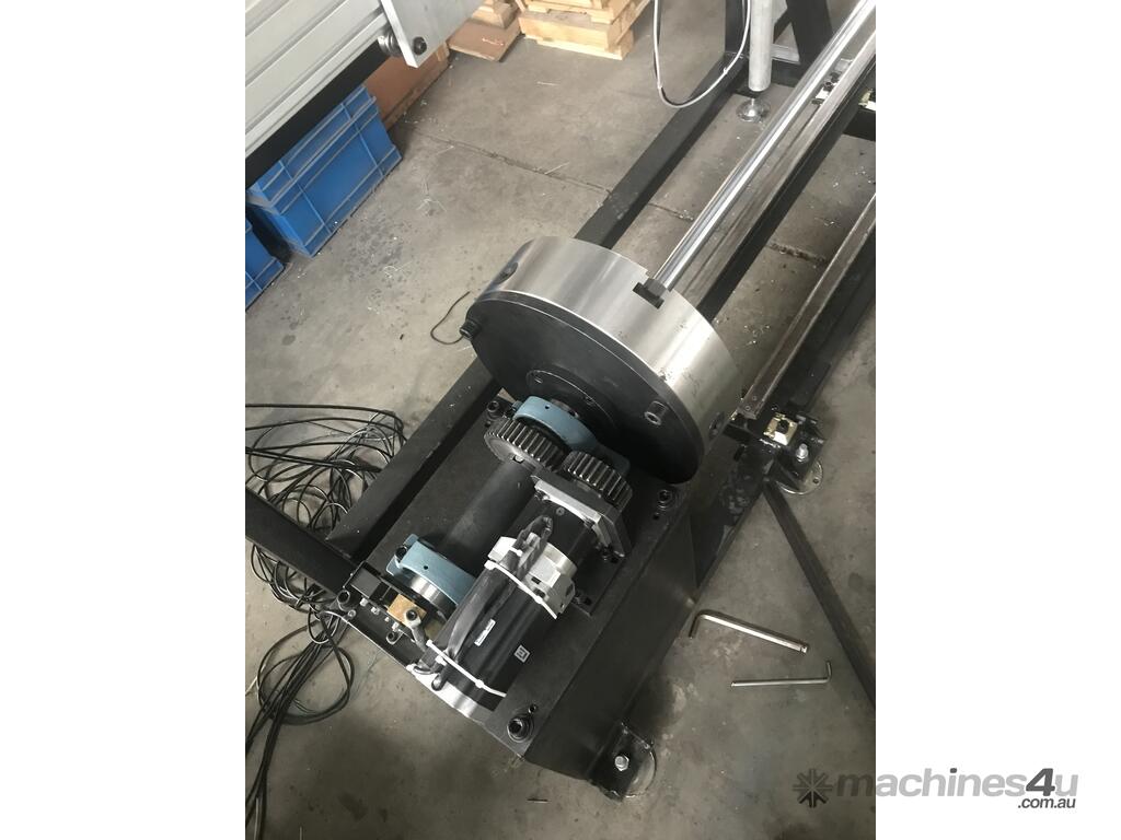 A chuck is fitted which has the scope of 50 - 520mm pipe clamping and is controlled by a servo motor and reducer. The cutting head is also servo driven ensuring accuracy. Depending on the length of the machine there are numerous pipe steadies along the lower table that are adjustable depending on the size of the pipe and run along guideways so they can be positioned to the desired distance.