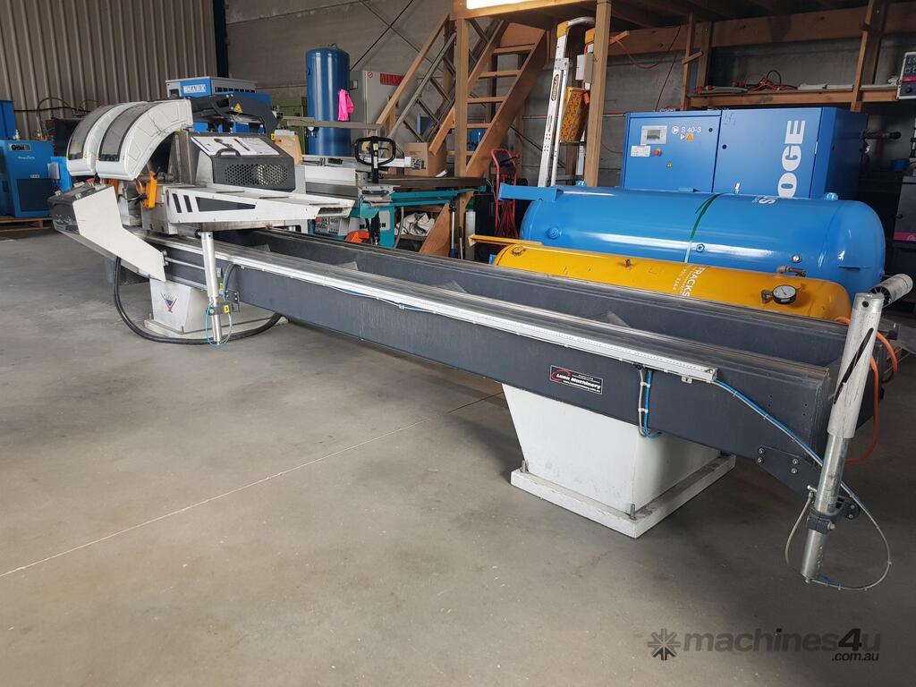 4). BROBO WALDOWN 400mm 240v Single Phase COMPOUND MITRE SAW TNF115 Year 2022 UNUSED, BRAND NEW, SUIT ALUMINIUM, PLASTICS etc 400mm TCT BLADE, SEMI-AUTOMATIC PNEUMATIC OPERATION INCLUDING 2 x VERTICAL PLUS 2 x HORIZONTAL AIR CLAMPS, 90degree + 45degree LEFT & RIGHT SWIVEL, SAW HEAD TILTS TO 45degree COMPOUND MITRE CUT, MIST SPRAY, MADE IN AUSTRALIA, HEAVY DUTY, INCLUDING 2 x 3 metre FACTORY METAL HEAVY DUTY INFEED / OUTFEED ROLLER TABLES, VIRTUALLY NEW, BOLTED TO ORIGINAL PALLET