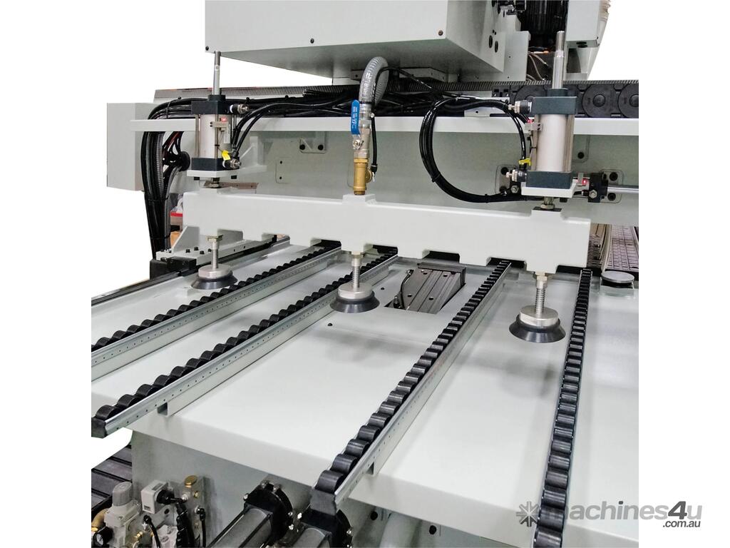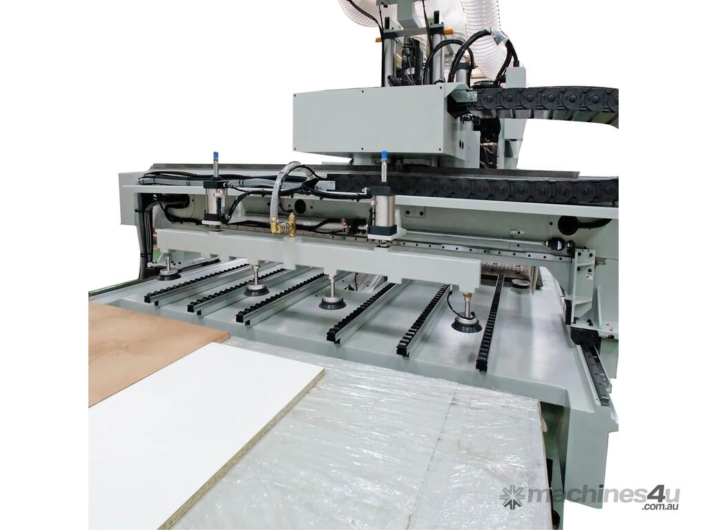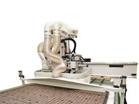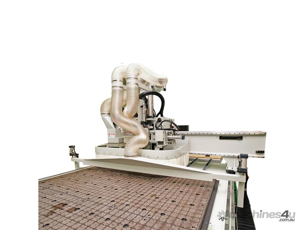 Efficient Vacuum & Workpiece Handling: Equipped with a vacuum pump (250 cbm/hour) and a hard phenolic table with automatic pop-up pins for flexible and secure workpiece holding.