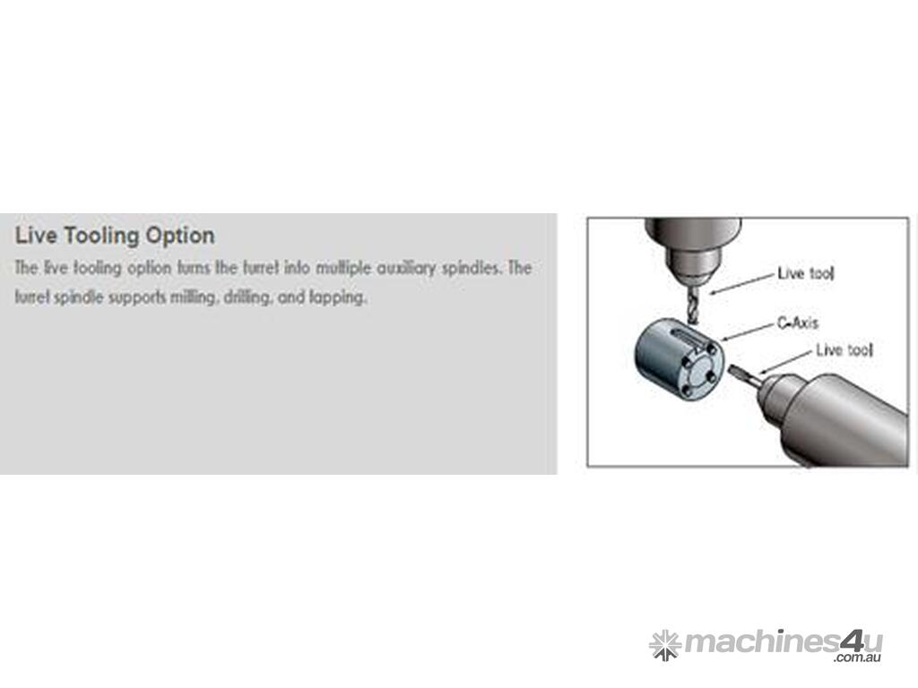 The live tooling option turns the turret into multiple auxiliary spindles. The turret spindle supports milling, drilling, and tapping.