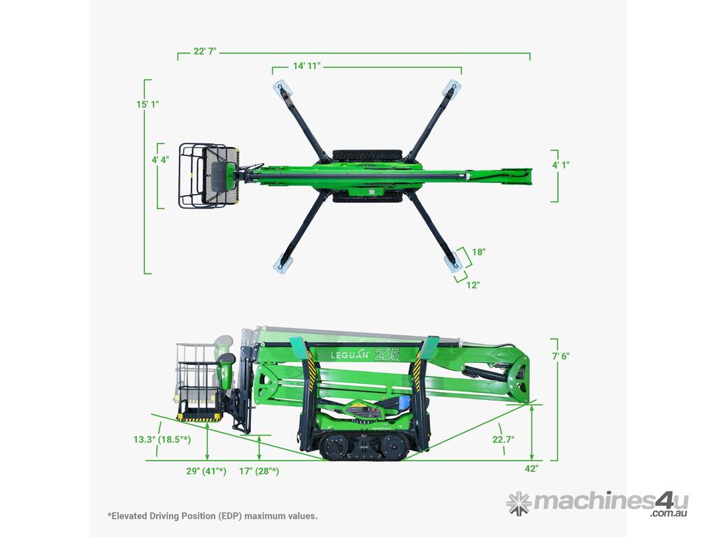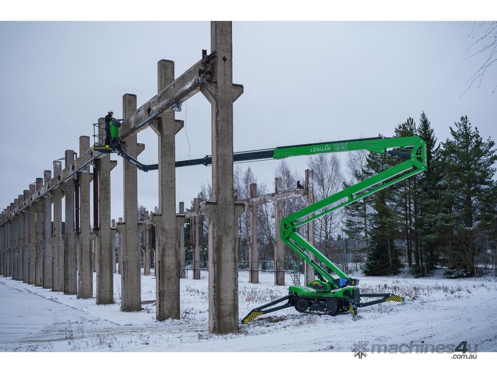 The Leguan 265 sets a new benchmark for efficiency and performance. As the fastest 27-meter spider lift in the world, it takes just 1 minute and 35 seconds to fully extend the booms to maximum working height. Its rugged track system, unrivalled ground clearance, and the market’s lowest centre of gravity provide exceptional stability and mobility, even in the most demanding environments.