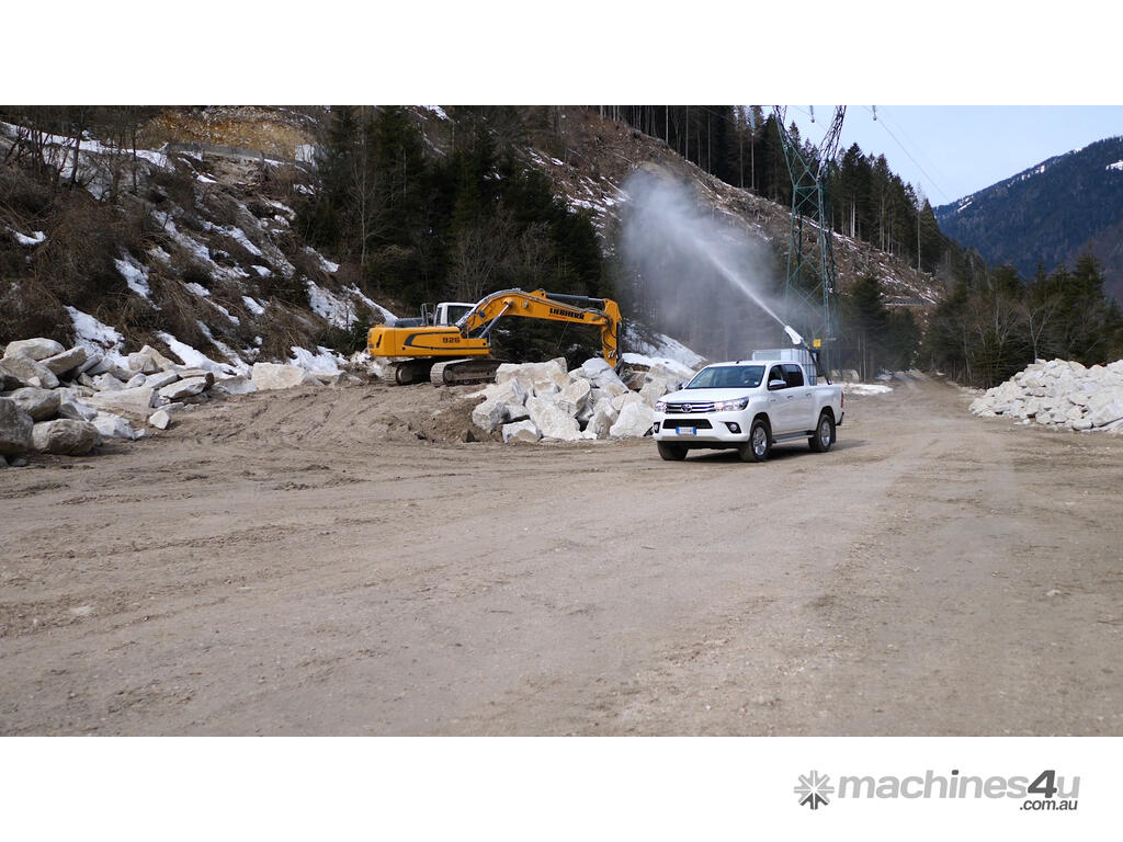 * IBC mounted unit fits into utes & small trucks with ease, turning them into small, manoeuvrable, fast-to-fill & fuel-efficient water carts. This allows for fully remote controlled, mobile dust suppression on haul roads, quarry faces, loading points, stockpile areas, and many places a regular water cart just can't get to!