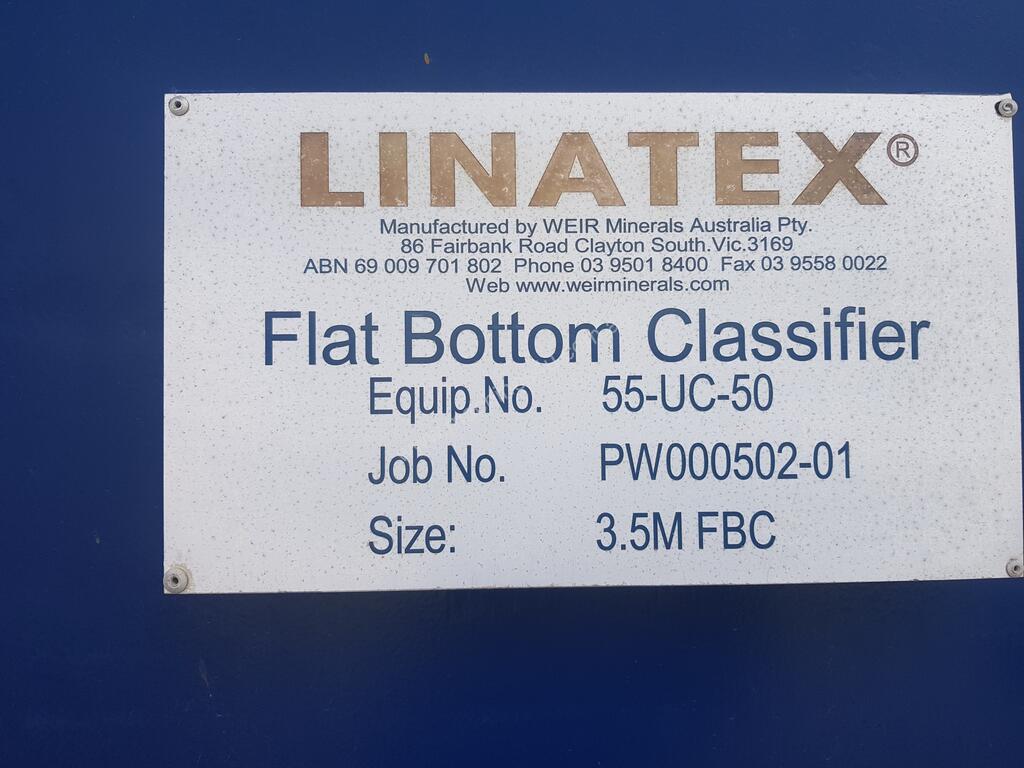 Unused Linatex 3.5m Flat Bottom Classifier. This unit has never been installed but is missing some nozzles, pneumatic cylinders, controller and the density probe.