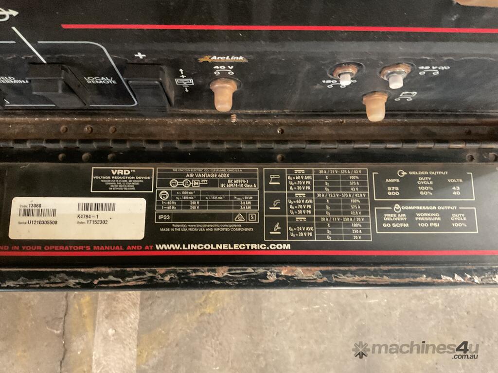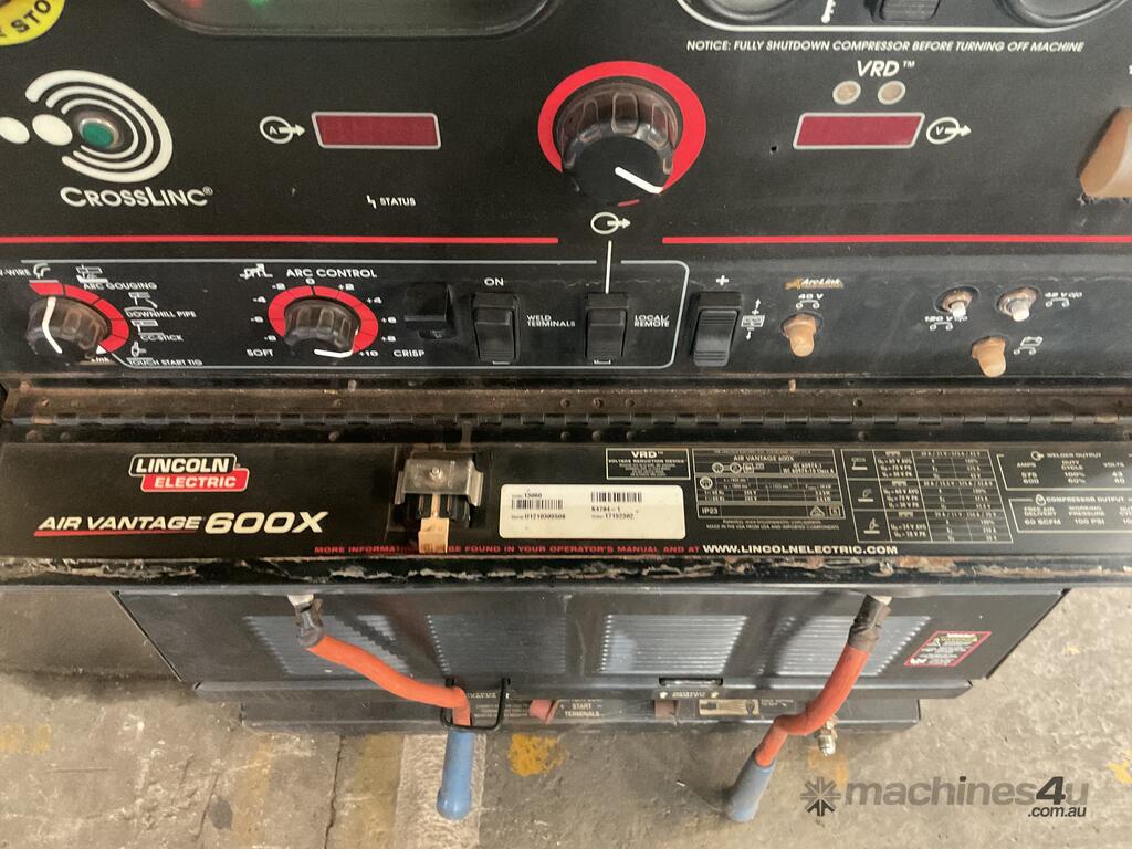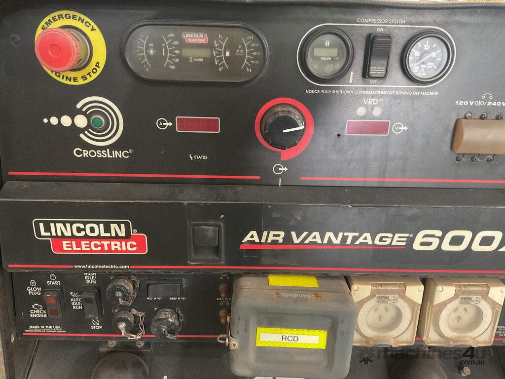 Lincoln Electric, Air Vantage 600x ,3 In 1 Multi Purpose Welder, 1,504.8 Hrs, 600Amps, Driven By Unbranded Diesel Engine, 60 SCFM Compressor, 864.2 Hrs, Includes Lifting Lug & Tyne Pockets, Two 240 Volt Outlets, Approx 1,750mm (L) x 800mm (W) x 1,5050mm (H),Serial No: U