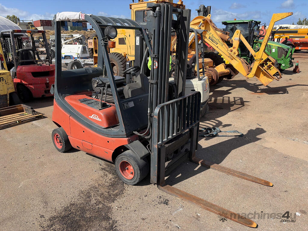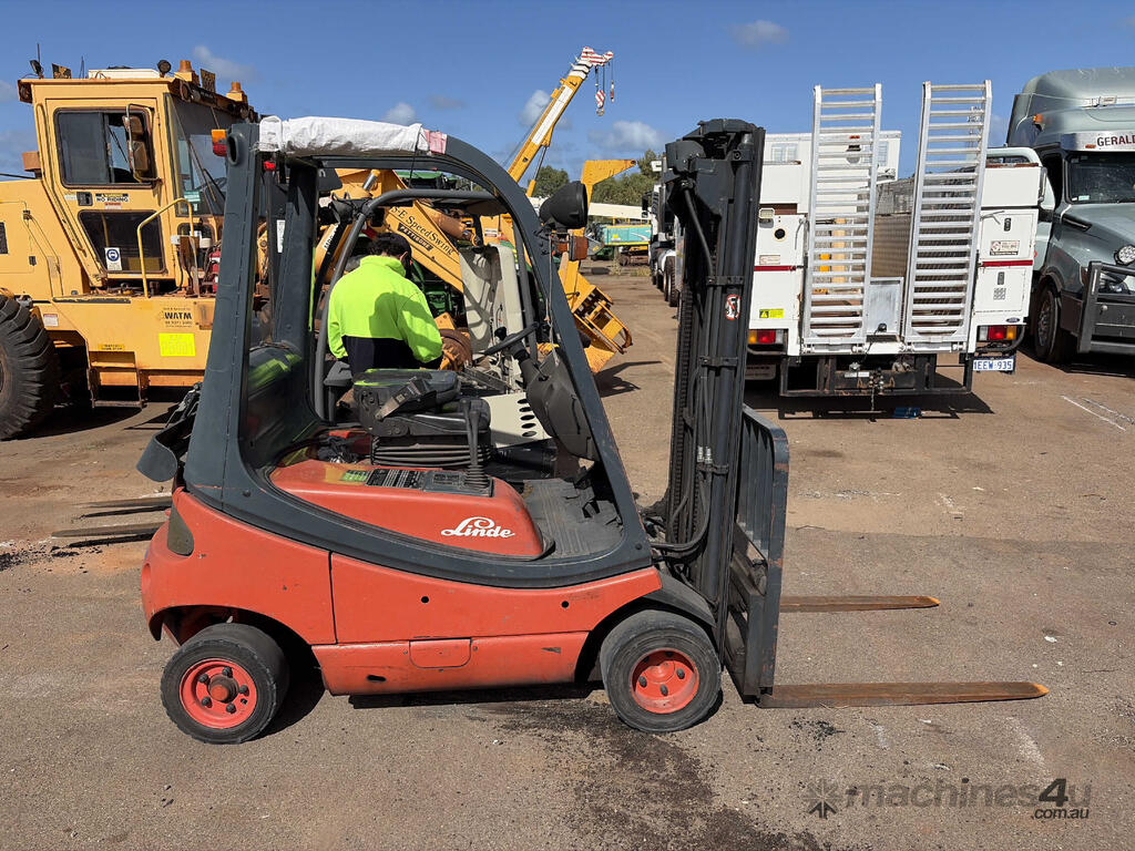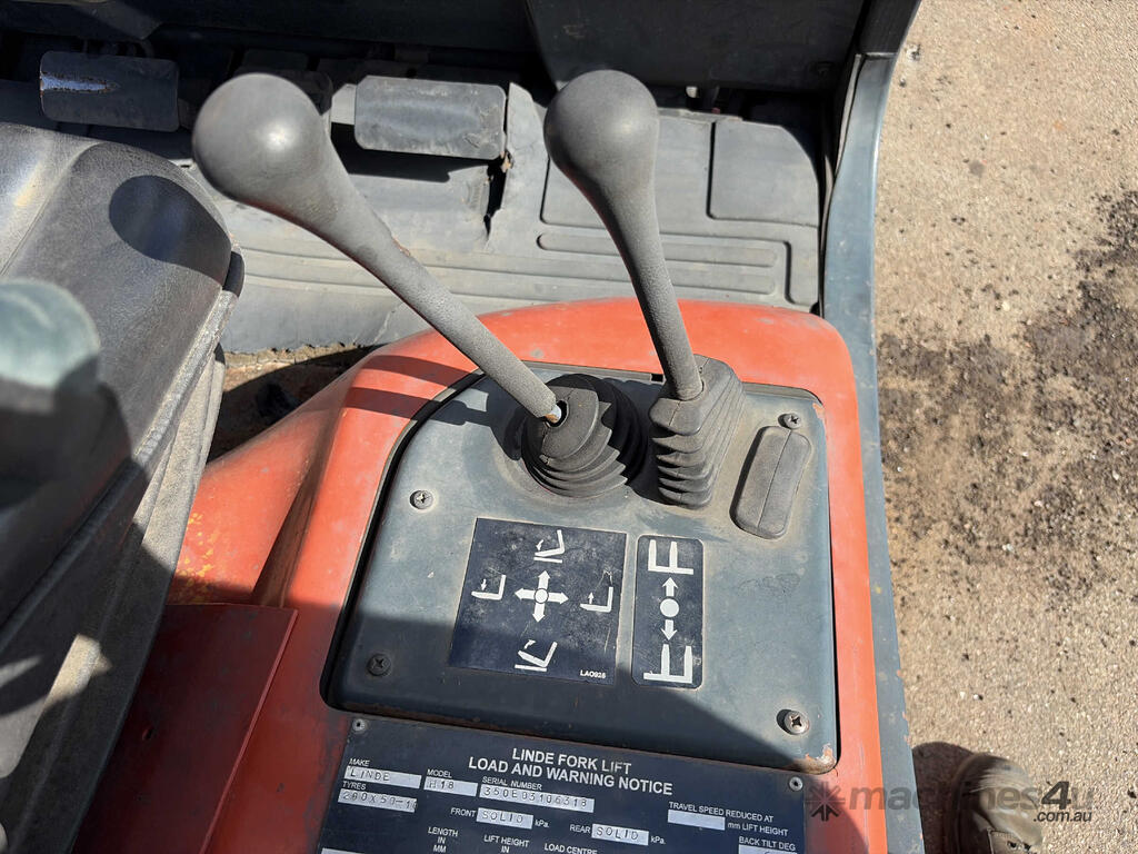 No C/P,Linde,H18,Forklift,4 Cyl,LPG only,Odometer not visible,4856 (Hrs. Showing on Hour meter),Colour: Red,Unregistered WA,Serial No: 350E03106318,Sold with No Plates