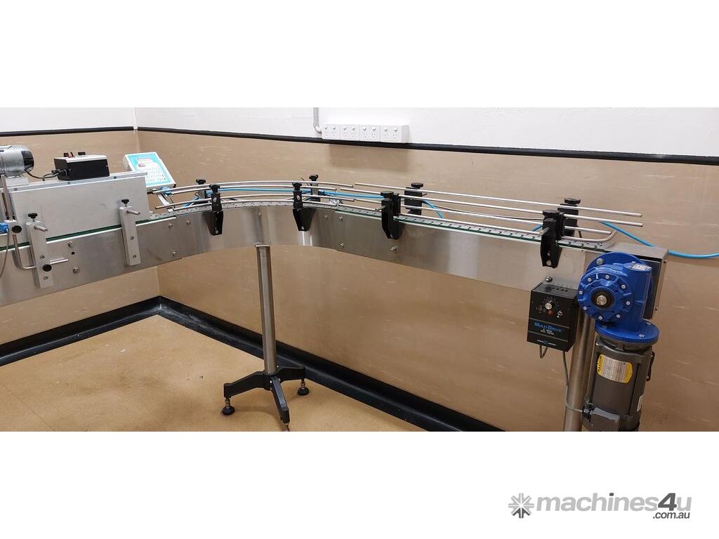 Liquid Filling, Capping and Labelling Line, consisting of 4-head stainless steel piston filler "Flowfill" 600ml fill capacity with bottom-up fill and gating, stainless steel infeed hopper with manifold and feeding pump, air-operated semi-automatic cap tightener, and single-head wrap-around self-adhesive labeller "Compact" model 600 complete with 128 barcode scanner for label version control, suitable for liquid filling applications in food, pharmaceutical, cosmetic and chemical industries, all set up on a 90 deg Slat Conveyor with speed controls