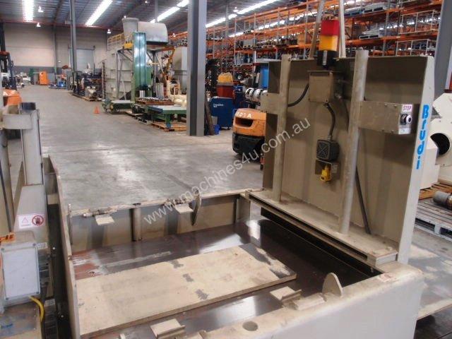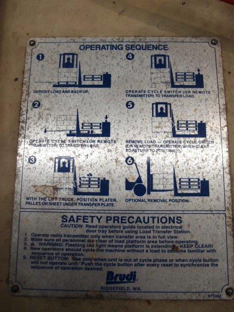 The brudi load transfer station is used to allow loads to be transferred from one pallet to another pallet or slip sheet and to provide a way to rotate the load 90 deg or 180 deg on a pallet.