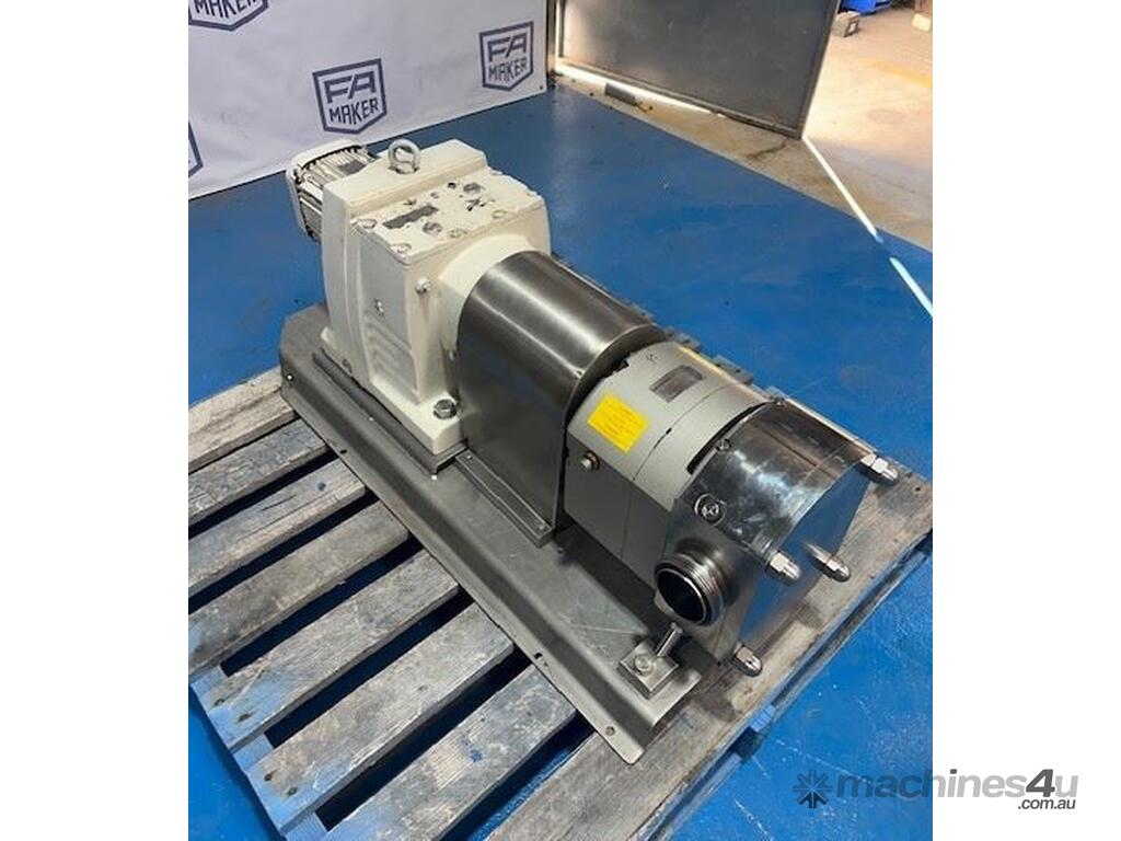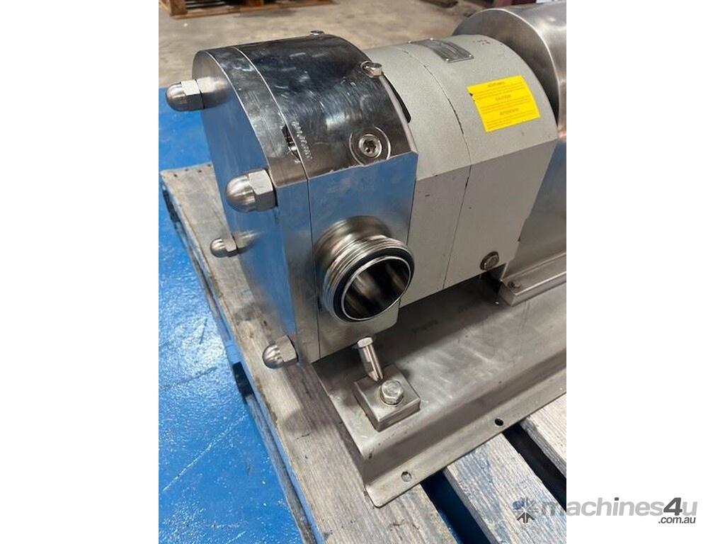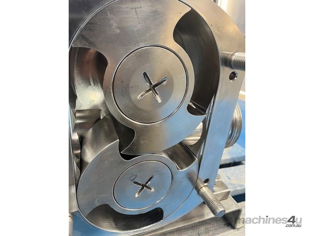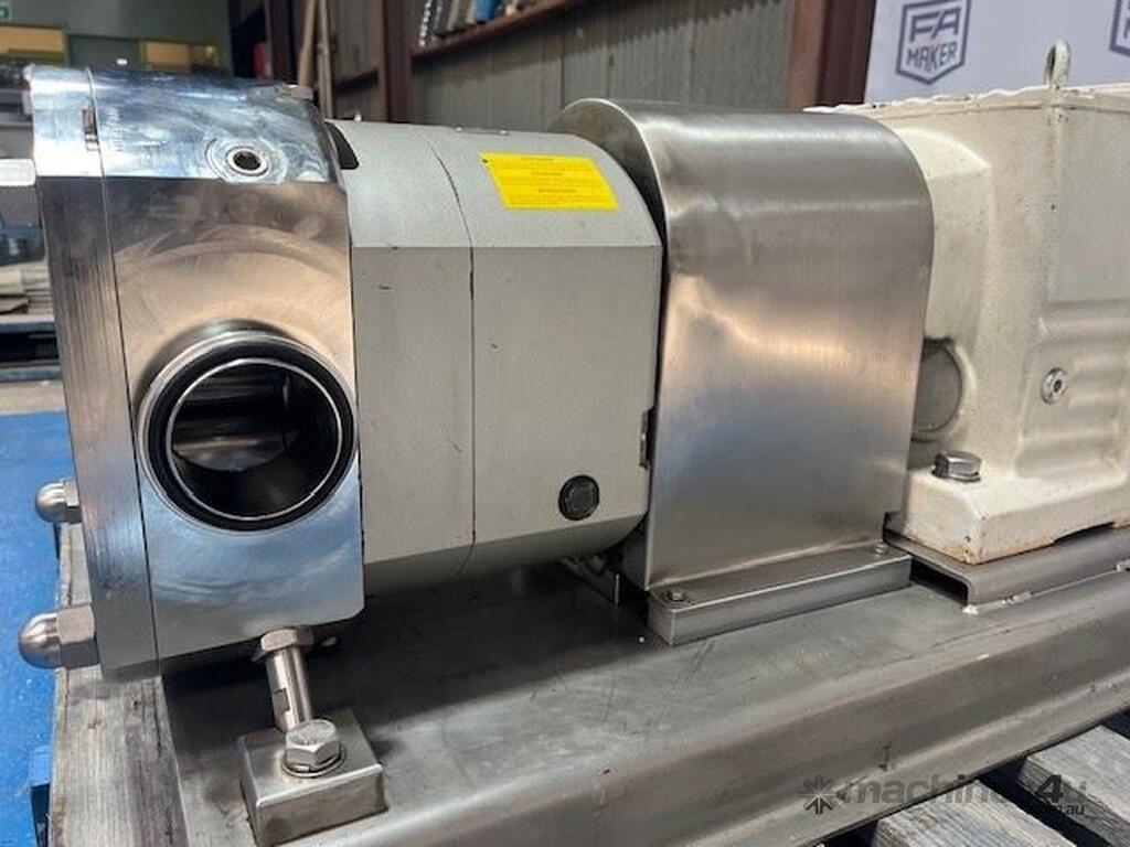 Nova lobe stainless steel 3 inch lobe pump. Last used to pump butter. Bi wing multilobe. Connection size 80mm 1.5kw 7.7rpm 596 lt per hour capacity at the current speed. This pump can run at a max 800 rpm so the geared motor could be changed to a faster rpm to increase output of pump. 1.29lt per revolution. 35mm max particle size. Mounted on stainless steel skid. Excelent condition. Made by GEA Hilge