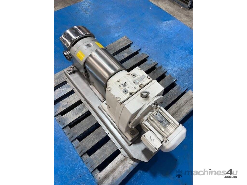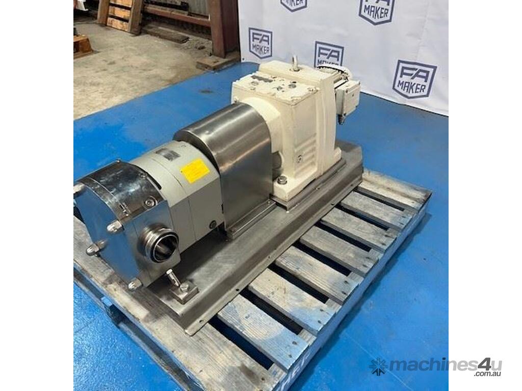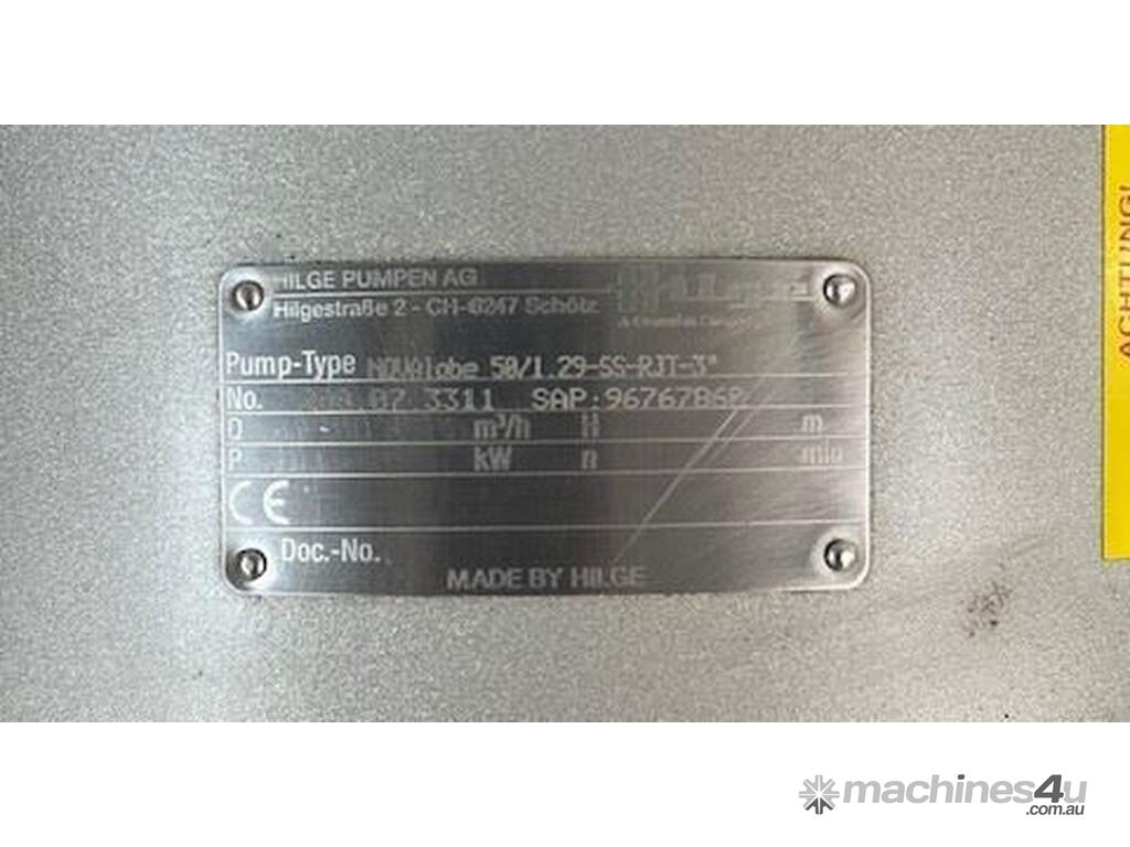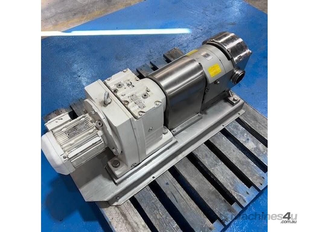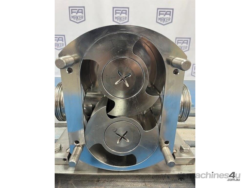 Nova lobe stainless steel 3 inch lobe pump. Last used to pump butter. Bi wing multilobe. Connection size 80mm 1.5kw 7.7rpm 596 lt per hour capacity at the current speed. This pump can run at a max 800 rpm so the geared motor could be changed to a faster rpm to increase output of pump. 1.29lt per revolution. 35mm max particle size. Mounted on stainless steel skid. Excelent condition. Made by GEA Hilge