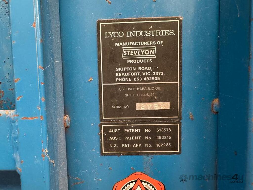 Stevlyon Mini-Matic Wool Press Serial No. 2794, manufactured by Lyco Industries. Fully automatic and hydraulic press. No Leaks in hydraulics. Last used 2 years ago. Good Working Condition.