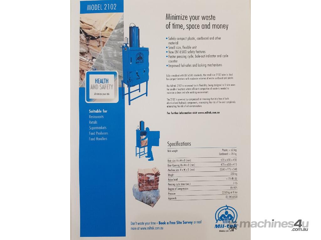 3. MIL-TEK VERTICAL CARDBOARD & PLASTICS BALING PRESS/COMPACTOR Model CP-102HD, ECO-DRIVE, Year 2015, MADE IN DENMARK, Compact Footprint, 14 Litre Capacity, Wide Front-Loading Door for CARDBOARD & PLASTICS, ECONOMICAL LOW COST, Air Operated, Simple Maintenance - No Electrics or Hydraulics Used - Pneumatic Operation Only, Light Use Only, Heavy Duty, As New. Must be Seen to Appreciate the AS NEW Condition, QUALITY & EASE OF OPERATION