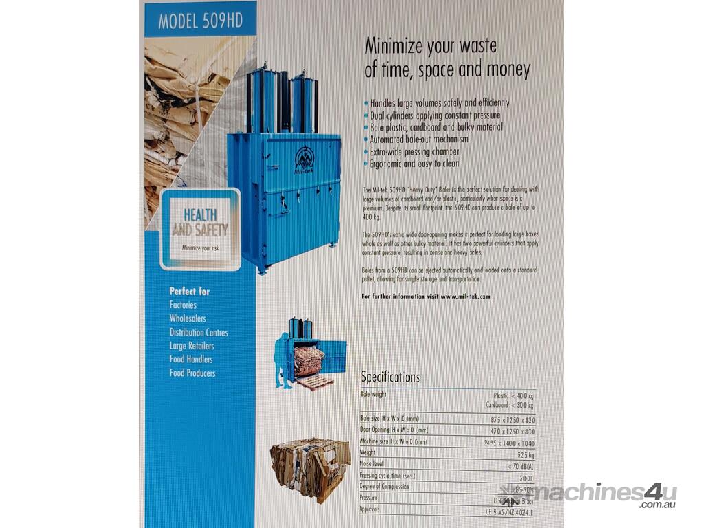 The Mil-tek 509HD 'Heavy Duty' Baler is the perfect solution for dealing with large volumes of cardboard and/or plastic, particularly when space is at a premium. Despite its small footprint, the 509HD can produce a bale of up to 400 kg.