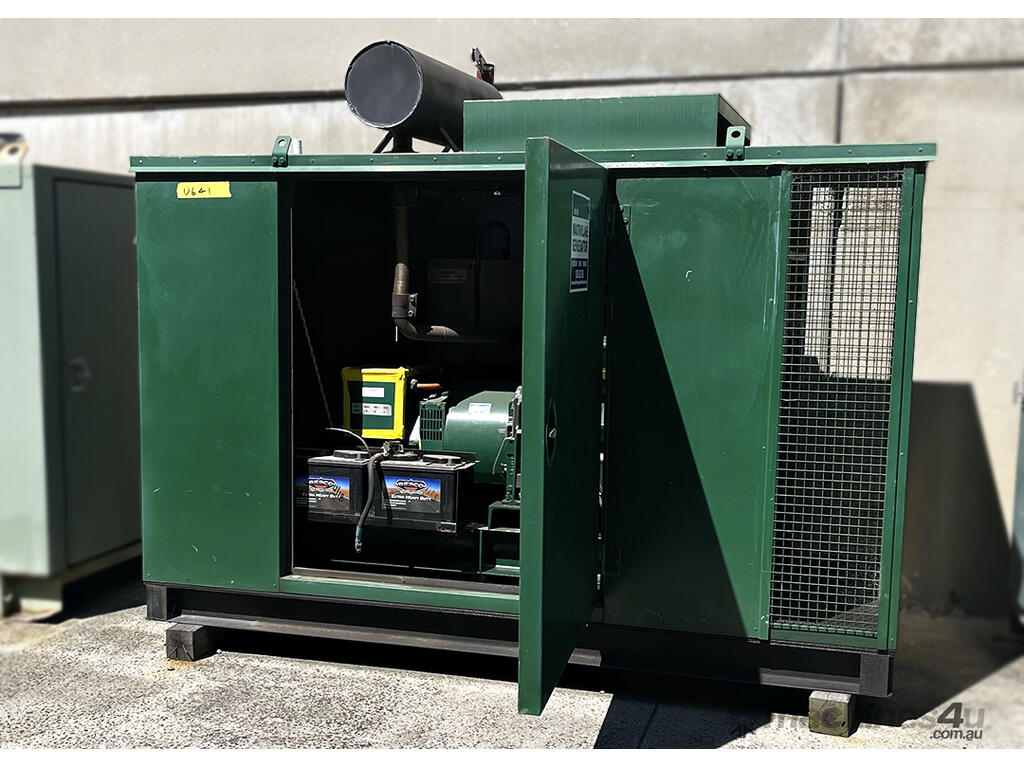 This used GEC Dorman 3DA enclosed generator has been freshly serviced, has low hours, and is mounted in a sound-reduced enclosure, with a base fuel tank, suitable for many applications.