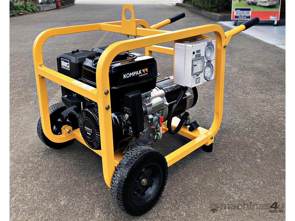 The New 1 phase Kompak PG8000TPE petrol generator is perfect for a worksite power source with 12.5hp OHV industrial engine, key and manual start, solid wheels and lifting hook, designed to meet Australian technical standards.