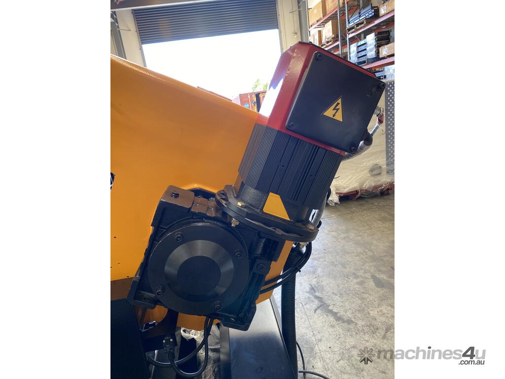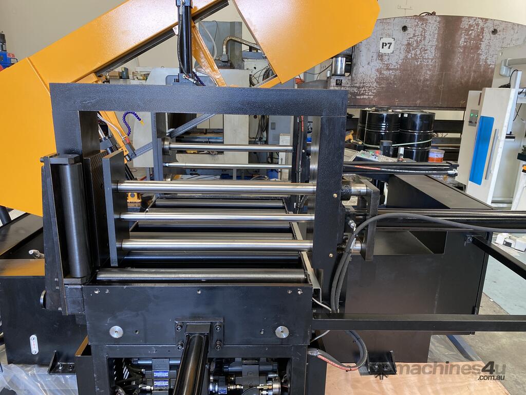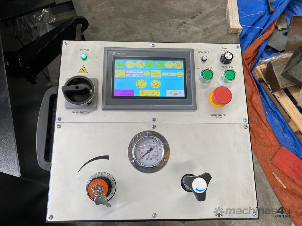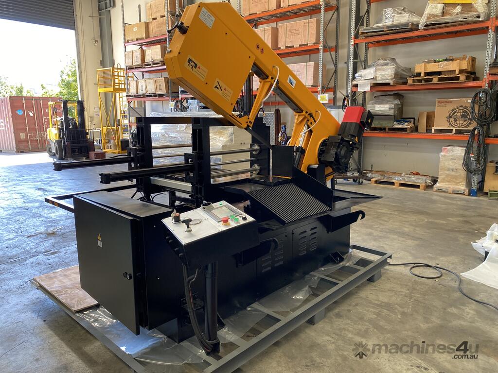 The Mastercut BS-650G is a large capacity mitre band saw at a very attractive price point. This machine comes standard with motorized angle movement controlled via the CNC color touch screen, a servo motor to control the blade speed, rigid construction, hydraulic vertical and horizontal clamping and automatic feeding of the material to the desired length.