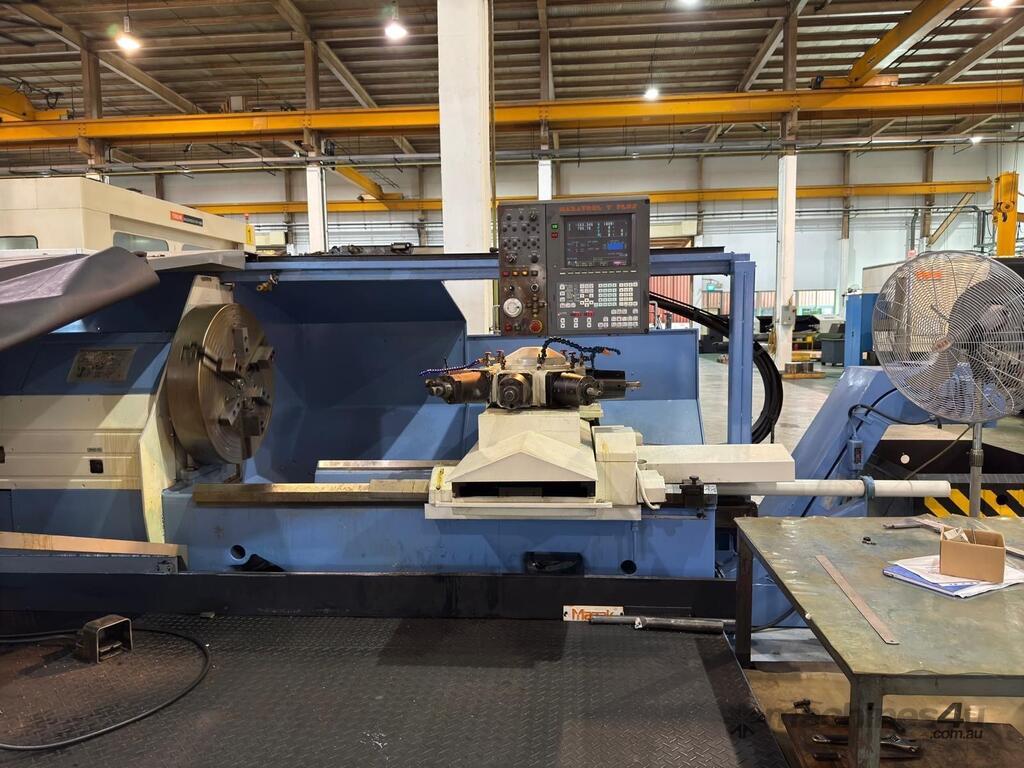 The Mazak Powermaster Chucker is a heavy-duty CNC lathe known for oilfield and large diameter work, featuring capacities like up to 39.37" (1000mm) max machining diameter, 60HP spindle, 1200 RPM max speed, and large spindle bores (e.g., 7" or 12.5"), with X/Z travels varying by configuration (around 25" X, 40-46" Z) and an 8-station turret for significant material handling. Key specs include a massive spindle bore for hollow work, high torque, and a robust build for tough materials.