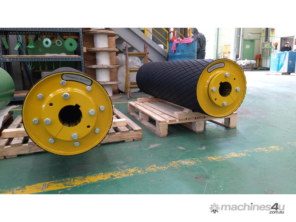 This magnetic pulley is installed with magnet inside the head pulley to separate magnetic materials of raw materials, while transferring from a conveyor to a belt. The pulley is designed in the same way as general head pulleys for easy installation. Pulleys can be manufactured in an electromagnet type or a permanent magnet type.