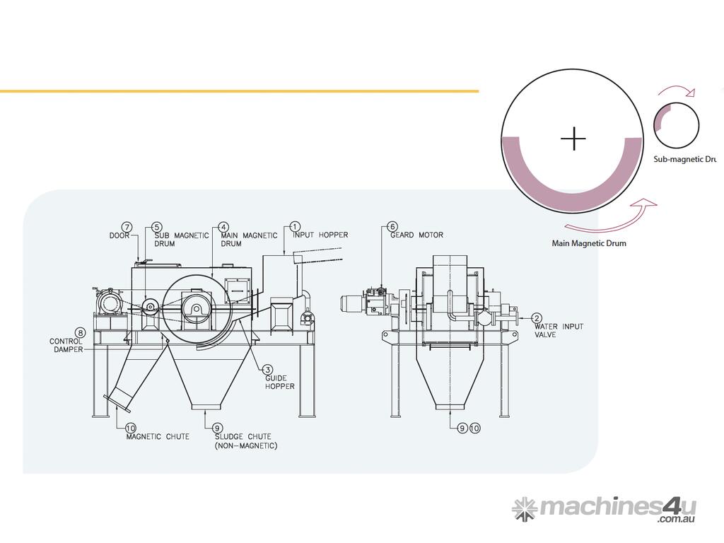 - Magnetic material is collected on the drum surface. Next, the magnetic material will be extracted in the secondary magnetic drum and discharged.