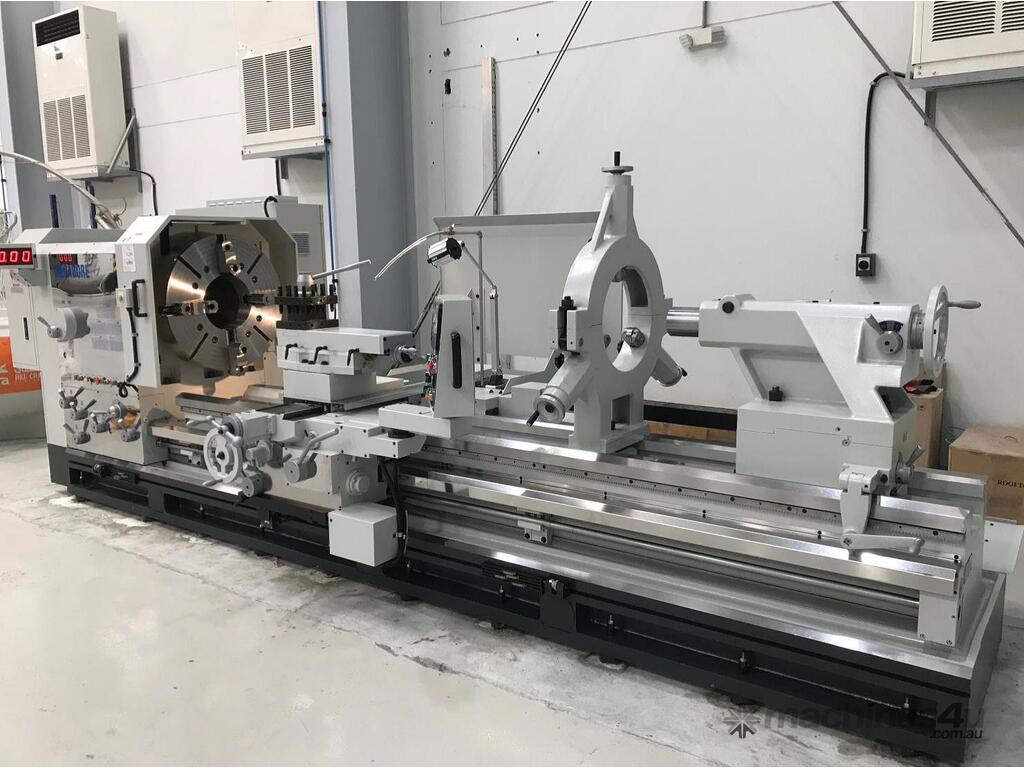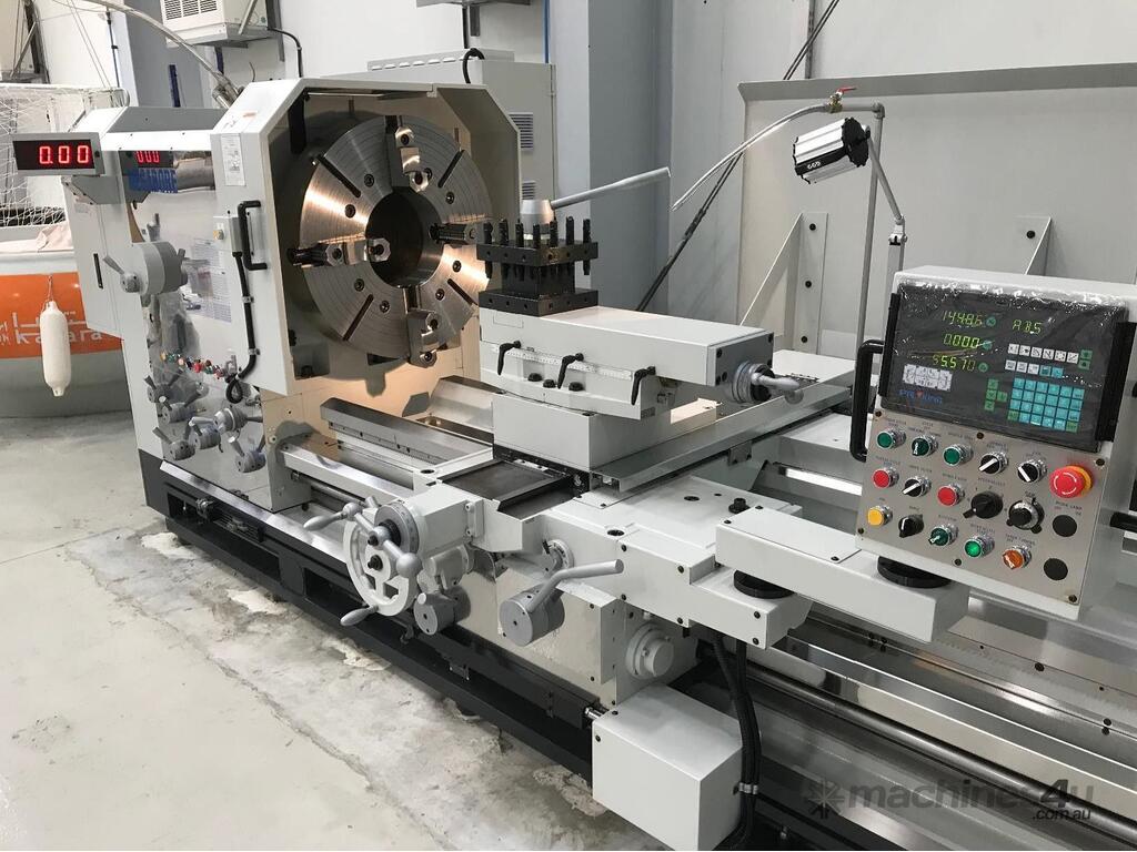 14" HOLLOW SPINDLE X 120" BETWEEN CENTERS THIS MACHINE IS FITTED WITH 2 X ALL STEEL 4 JAW CHUCKS. HYDRAULIC TAPER TURNING AND SEMI AUTO THREADING SYSTEM FOR STANDARD API THREADS. 2 AXIS DIGITAL READOUT.
