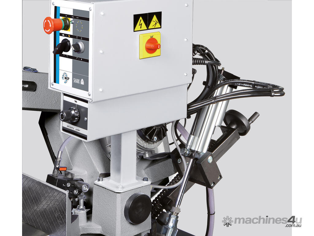 SHARK 282 CCS (Cut Control System) manual bandsaw machine to cut from 0º, 45º right up to 60º left. Other than the manual cut mode, the bandsaw machine can make single cuts without operator, using the head weight controlled by a hydraulic brake: after the cut, the band stops. The frame at this point is manually lifted to the position needed in order to reposition the bar to cut.
