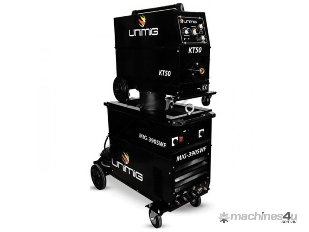 The UNIMIG 390 SWF is supplied with a completely enclosed KT 50 wire feed unit which helps prevent dust and moisture fouling your wire and contaminating your weld. It comes with a set of fully covered 10 metre interconnecting cables and wheels for increased maneuverability.