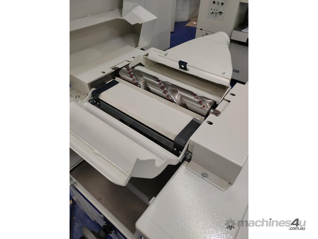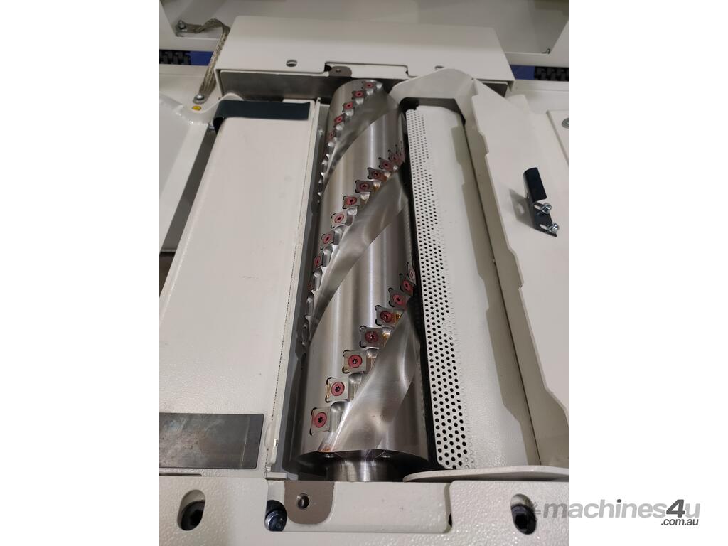 The machine comes Standard with SCM Patented Xylent Spiral Cutter Head with 3 rows of turn over 4 sided cutters. (Watch the video to the noise comparison)