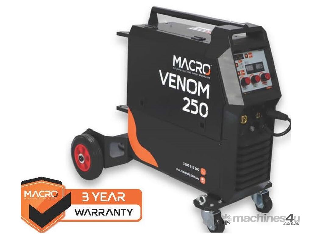 The Macro Venom 250 MST Compact is a highly powerful single phase MIG that also has D.C Tig functions. 3 year warranty, 4rd gear driven metal feed roller system and Binzel style torch.