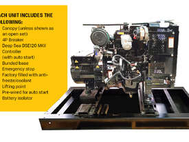 • Operates at 1500 rpm, direct injection 4-stroke diesel. Water-cooled with radiator available.