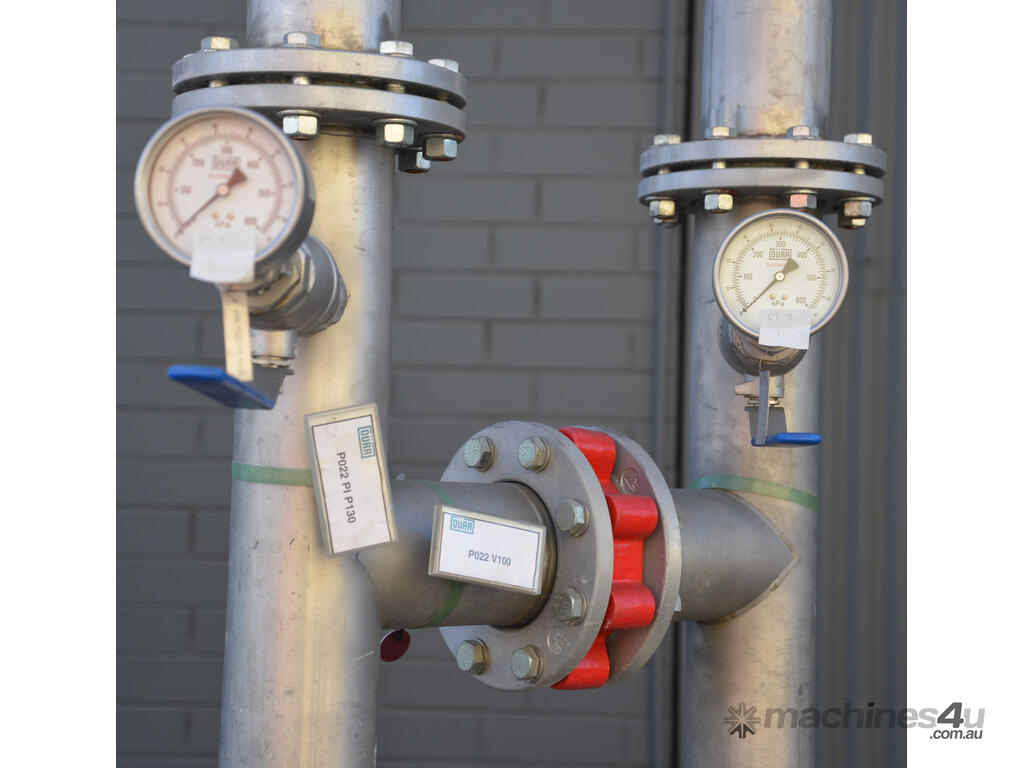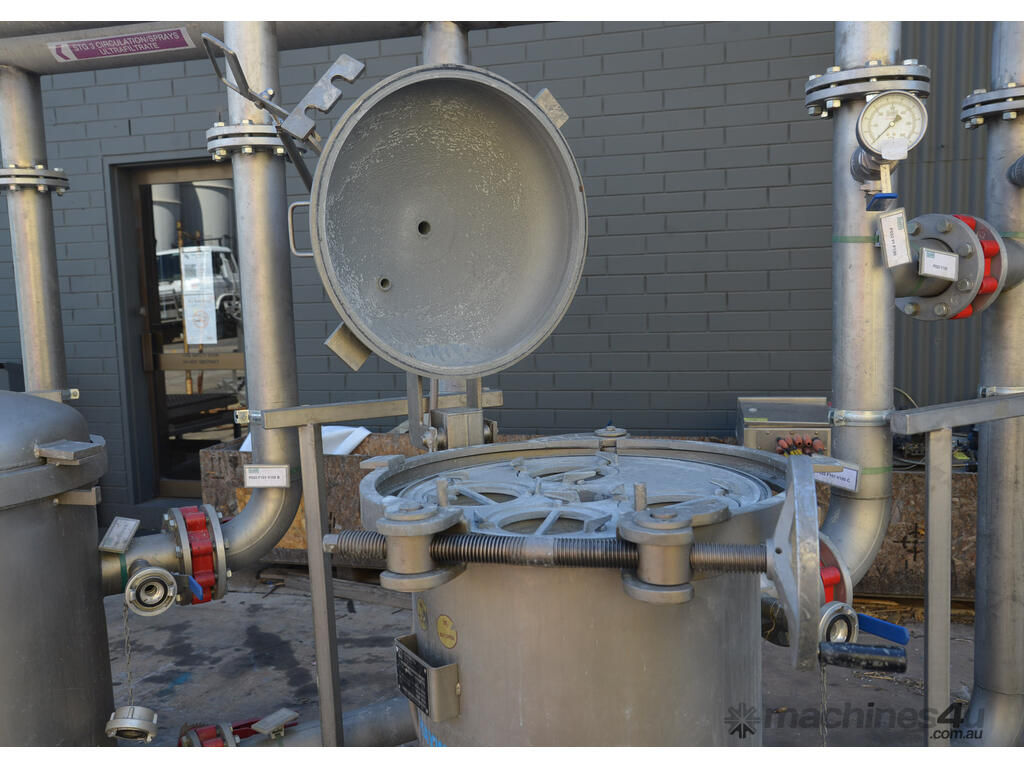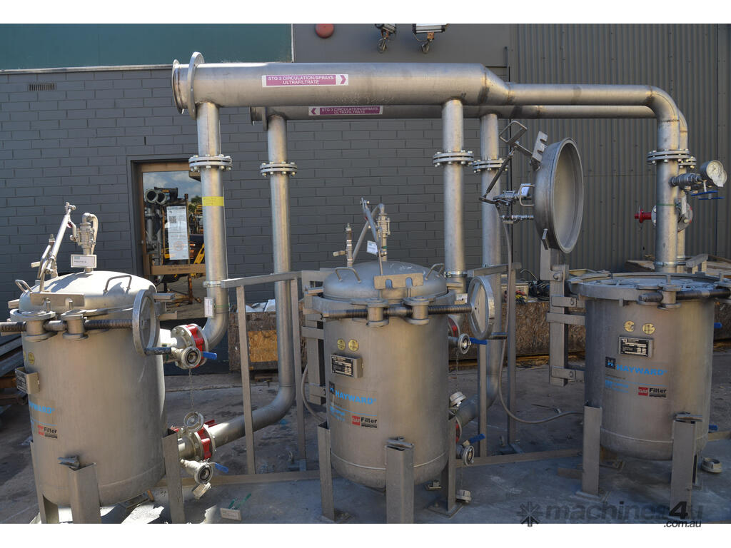 Hayward GAF Eaton 4 pot bag filter filtration filters manifold manifolded set of 3 stainless steel pressure housing, 4 bags per housing. 4" 100mm connections to filter vessels , 8' 200mm connections to manifold.