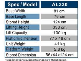 Maximize productivity and safety with our manual lifting device, designed for heavy-duty performance. The AL330 max load capacity of 130kg and a max lifting height of 330 cm, making it ideal for lifting and transporting heavy loads with ease.