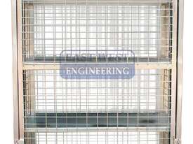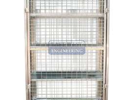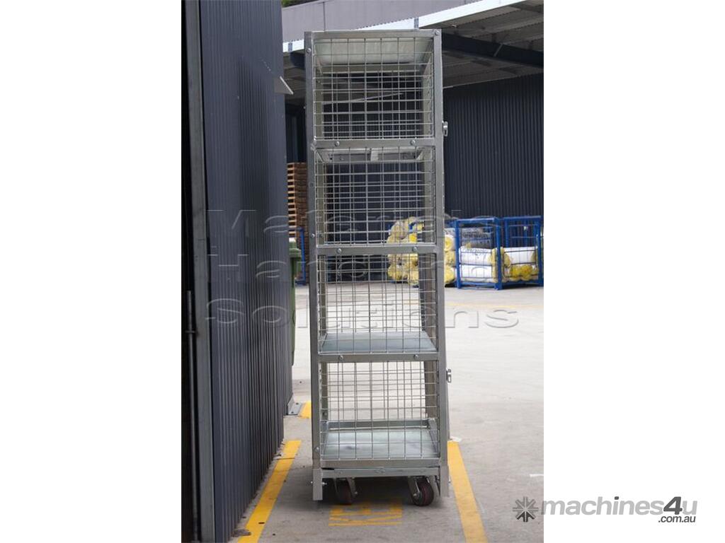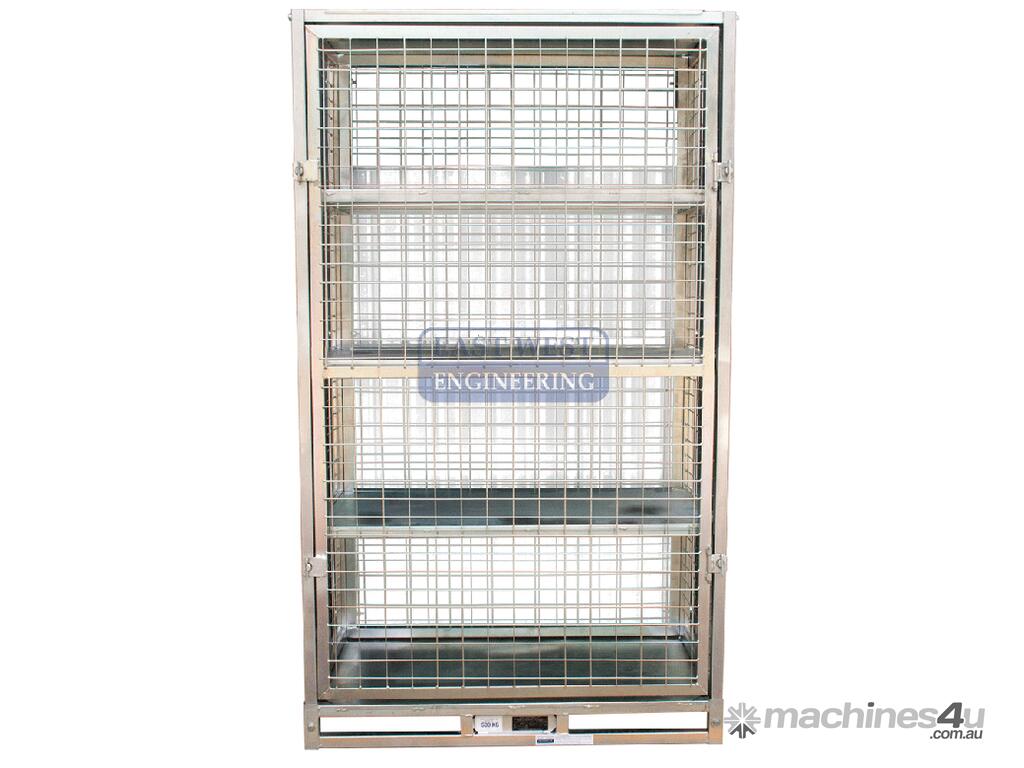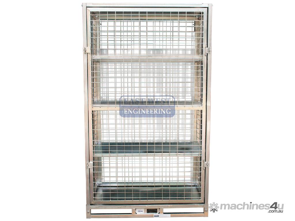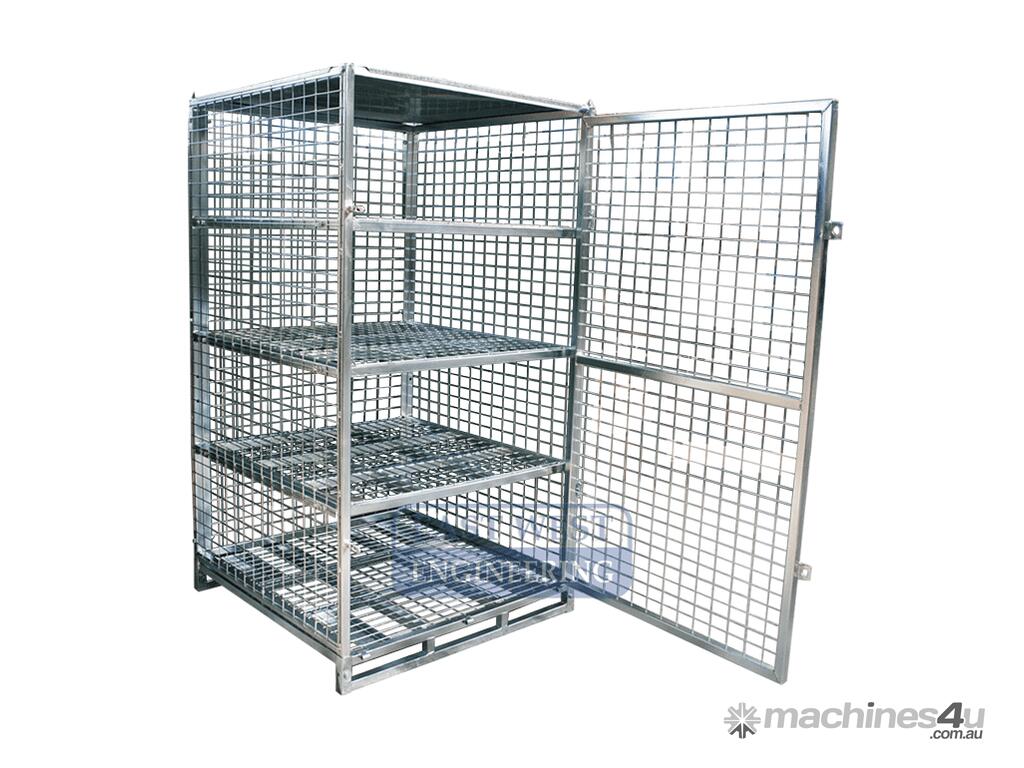 The gate can be hinged on either side or removed Three removable shelves for flexible storage options Forklift accessible base for easy transportation Made with sheet metal shelves, mesh sides and a galvanised sheet roof It can be assembled or disassembled as required for economic storage and transport Optional wheel kit (100mm diameter, 2 fixed, 2 swivel) available on request Zinc finish The mesh storage cage is supplied as a fully assembled unit.