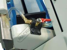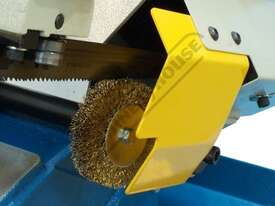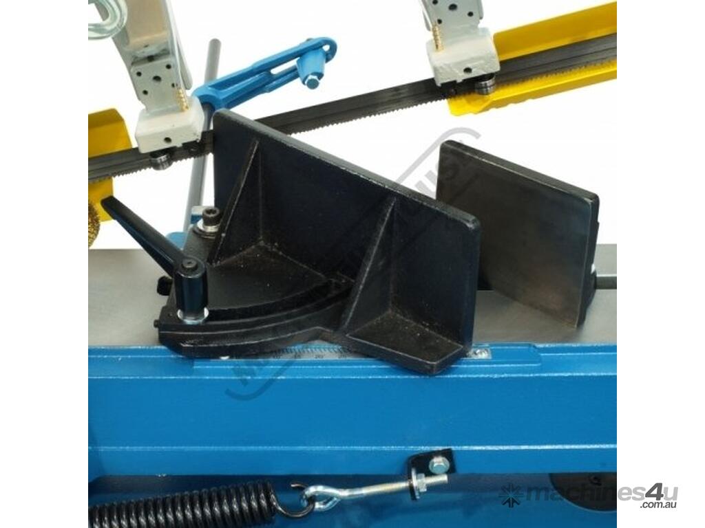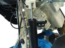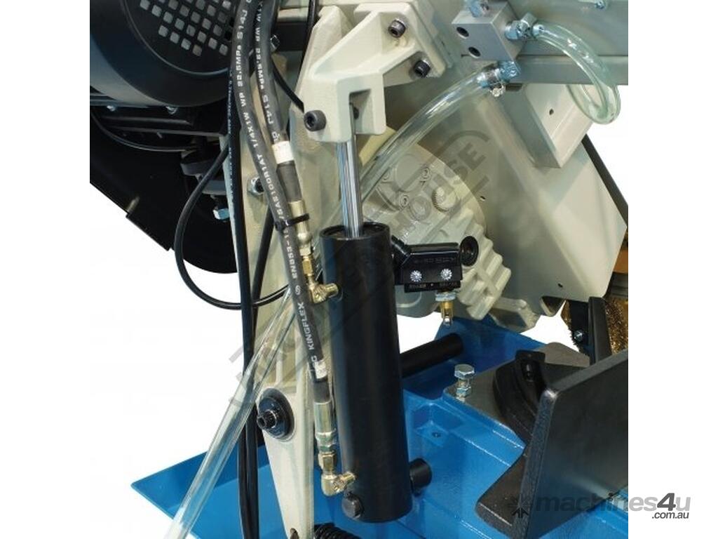 The downward cutting pressure is controlled by a fully adjustable hydraulic damper with an on/off valve and there is an automatic cut-off at the end of the cut. The vice rotates for mitre cutting and there is an adjustable material stop for consistent repeat length cutting.