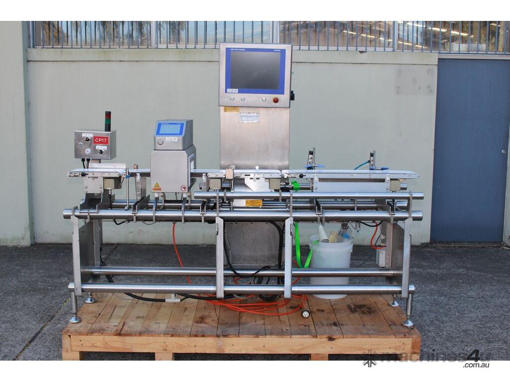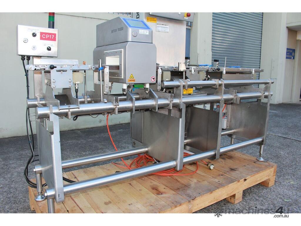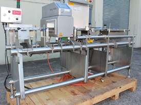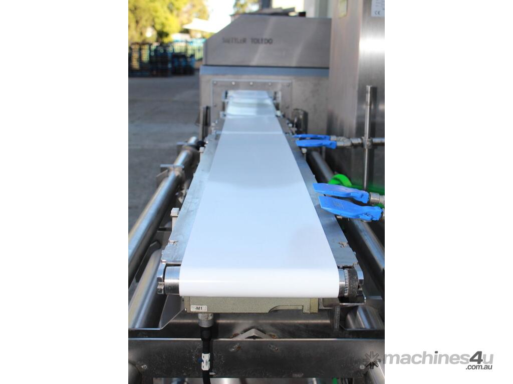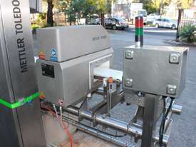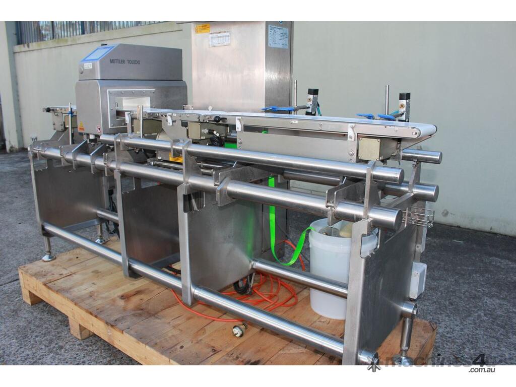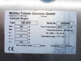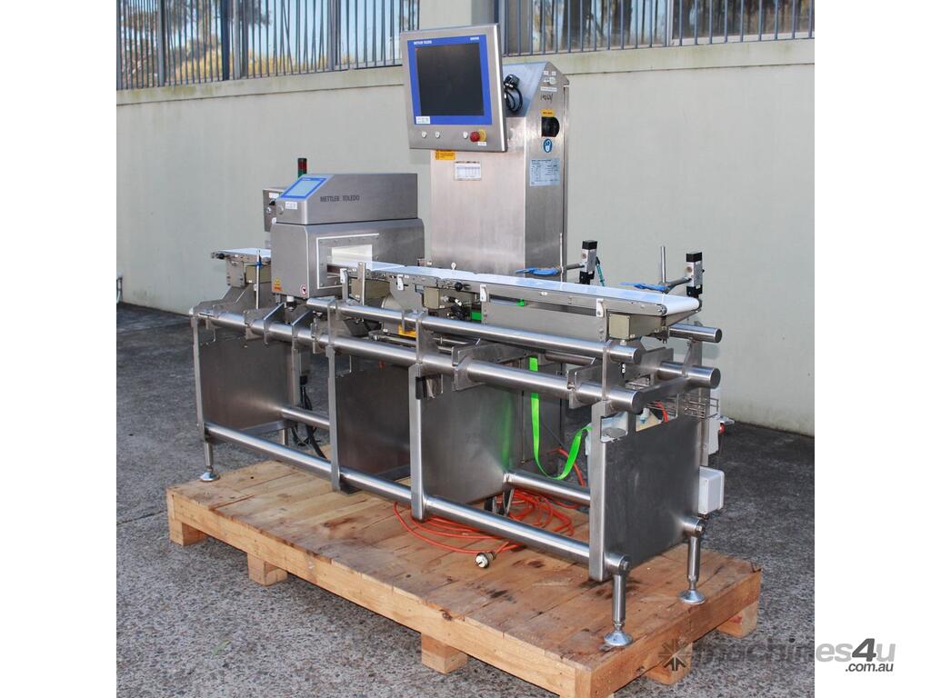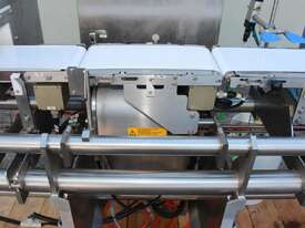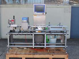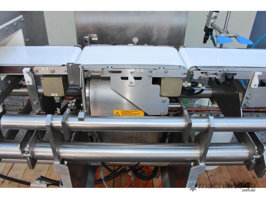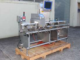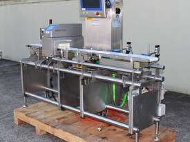 Metal Detector, Checkweigher & Rejector, “Mettler Toledo” model CM3570 CombiChecker, max. weighing capacity 300g x 0.1g, high speed check weighing, with air jet rejector, stainless steel structure, touch screen controller. 150 mm wide x 300 mm long infeed conveyor, 150 mm wide x 600 mm long conveyor for the metal detector which has a 200 mm wide x 59 mm high aperture, 150 mm wide x 300 mm long check weigher conveyor and a 150 mm wide x 800 mm long outfeed conveyor