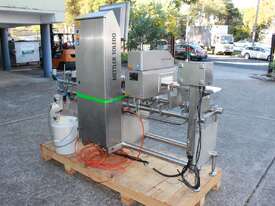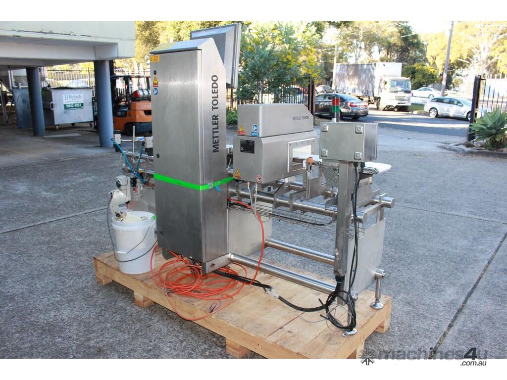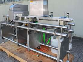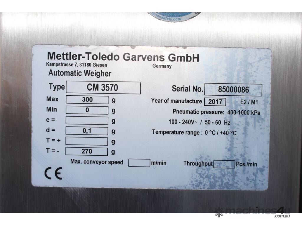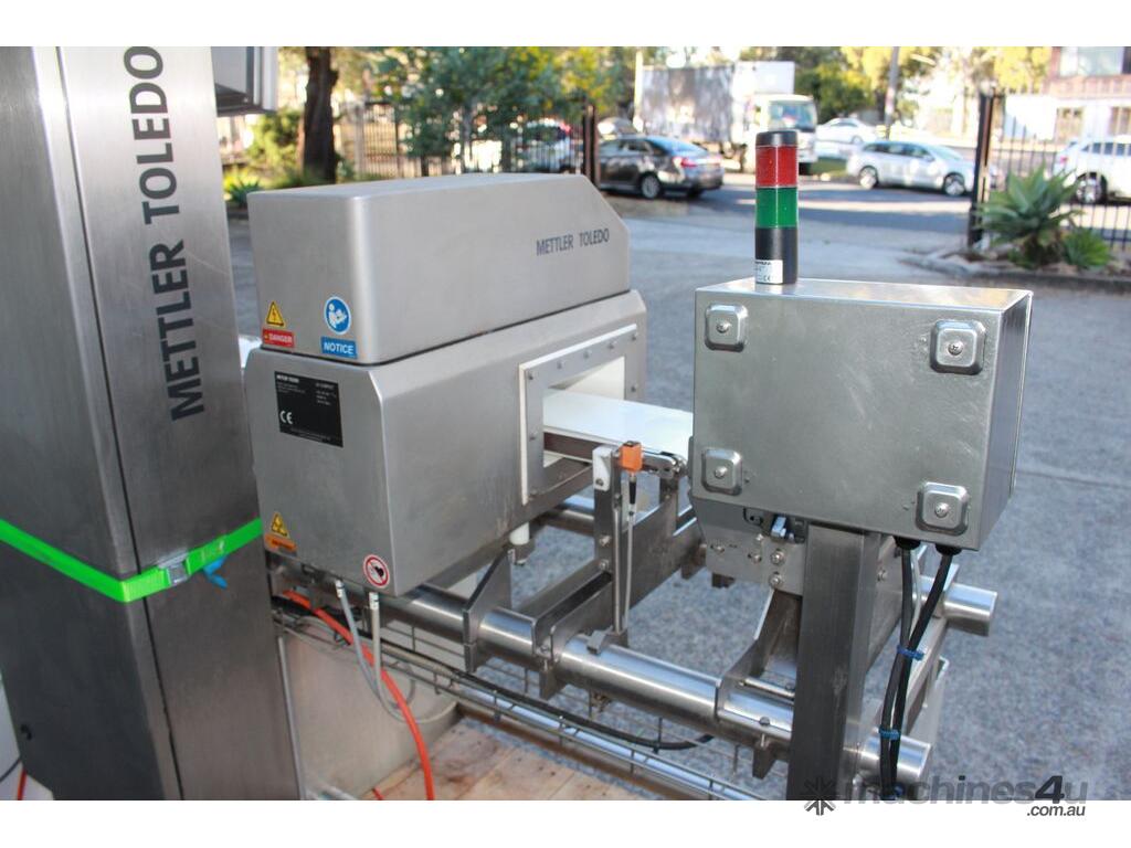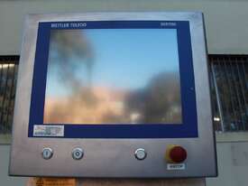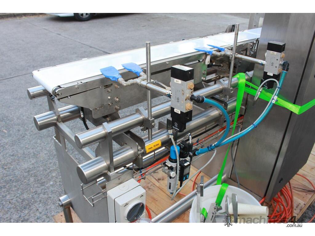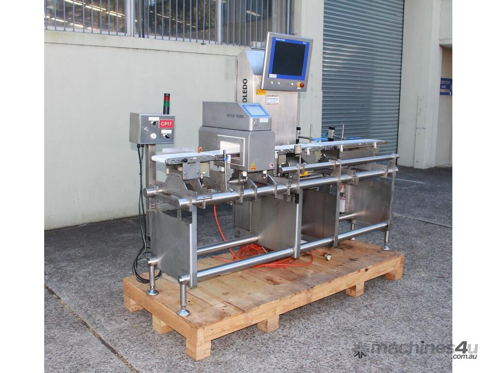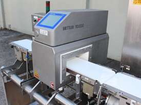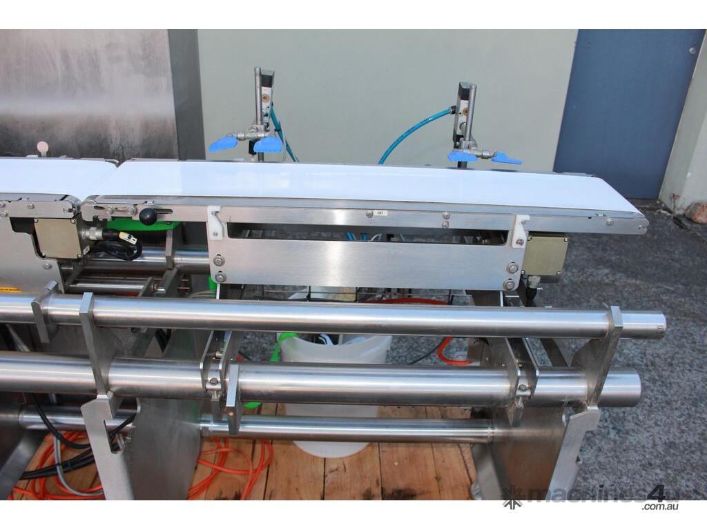 Metal Detector, Checkweigher & Rejector, “Mettler Toledo” model CM3570 CombiChecker, max. weighing capacity 300g x 0.1g, high speed check weighing, with air jet rejector, stainless steel structure, touch screen controller. 150 mm wide x 300 mm long infeed conveyor, 150 mm wide x 600 mm long conveyor for the metal detector which has a 200 mm wide x 59 mm high aperture, 150 mm wide x 300 mm long check weigher conveyor and a 150 mm wide x 800 mm long outfeed conveyor